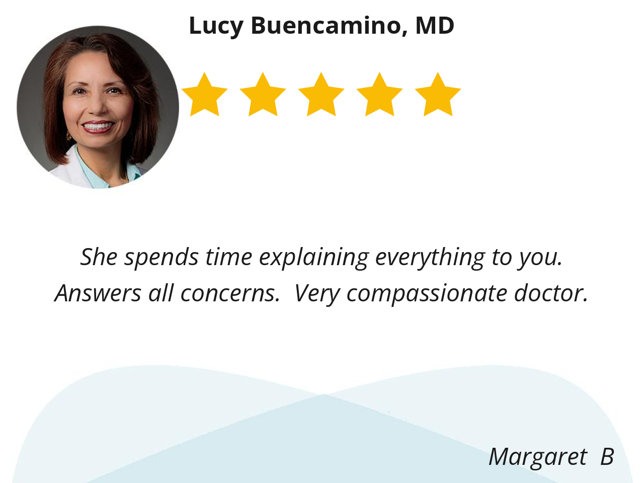 I like that Dr. Buencamino always listens carefully, takes her time, and never leaves me feeling rushed. She addresses my concerns and emphasizes prevention and healthy lifestyle adjustments before resorting to medication, which I appreciate. I trust her which is why I continue to see her.
