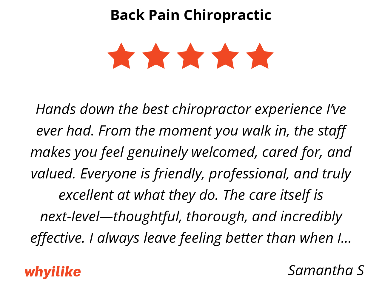 Hands down the best chiropractor experience I’ve ever had. From the moment you walk in, the staff makes you feel genuinely welcomed, cared for, and valued. Everyone is friendly, professional, and truly excellent at what they do. The care itself is next-level—thoughtful, thorough, and incredibly effective. I always leave feeling better than when I walked in. If you’re looking for outstanding care and an amazing team that actually cares about your well-being, this is the place. Highly, highly recommend!