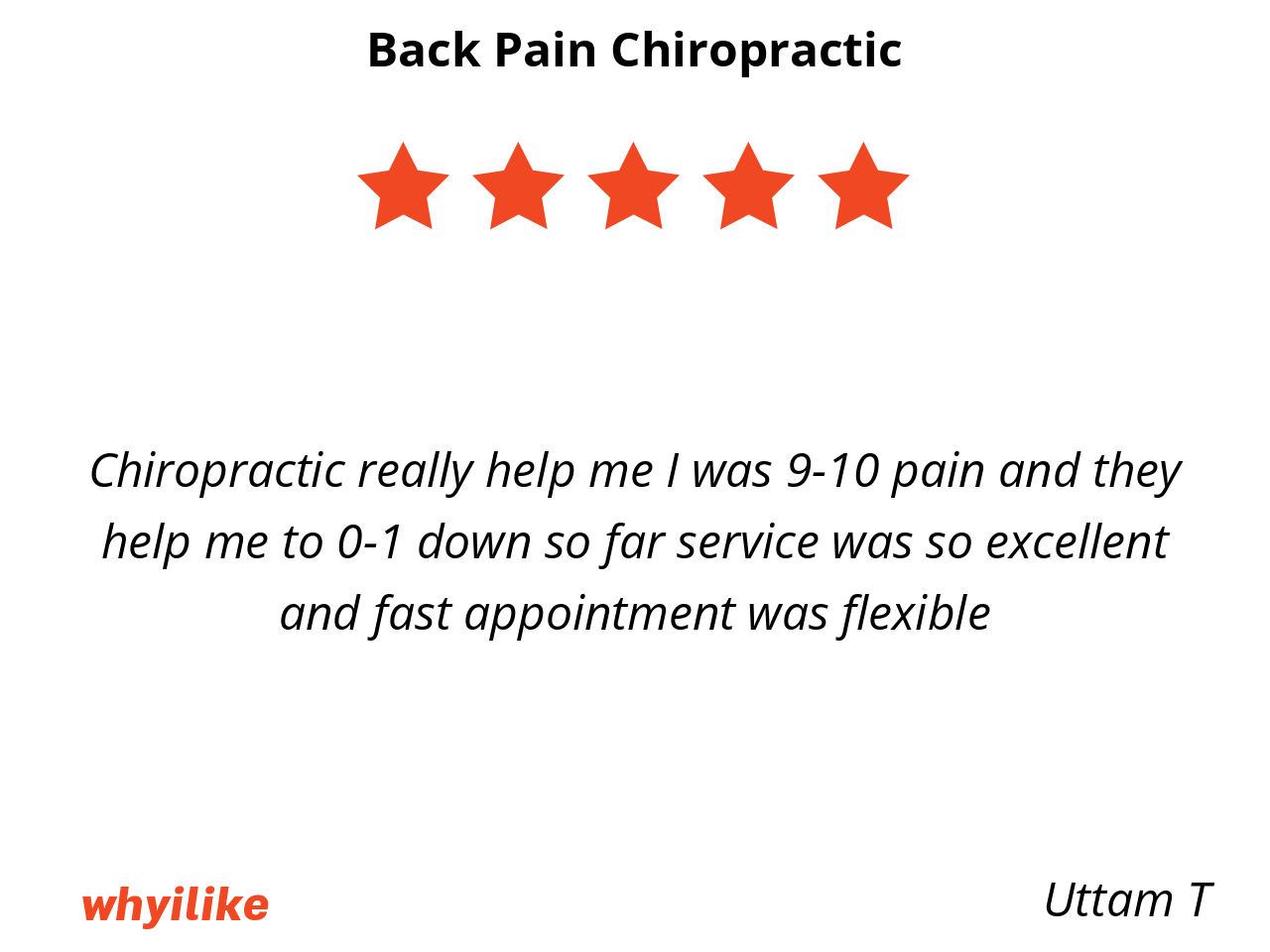 Chiropractic really help me I was 9-10 pain and they help me to 0-1 down so far service was so excellent and fast appointment was flexible