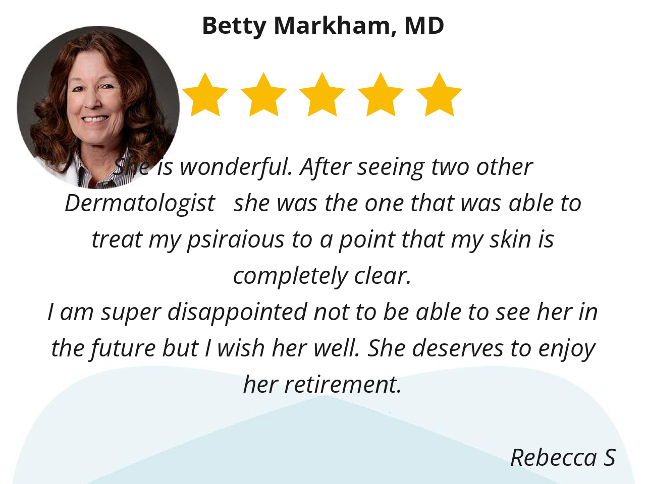 I like and appreciate Dr. Markham because she listens to me and is honest with me in all matters of my skin care and maintenance. Thank you, Dr. Markham, for your caring and concern for me!
