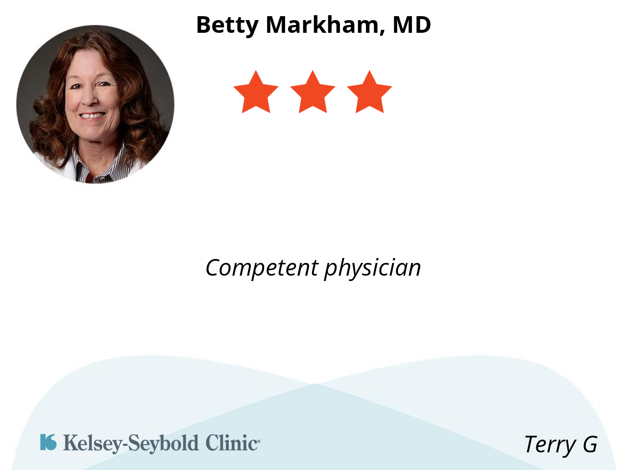 Long tenured Kelsey Doctor of Dermatology, Very professional. Not real chatty, gets directly to the point.