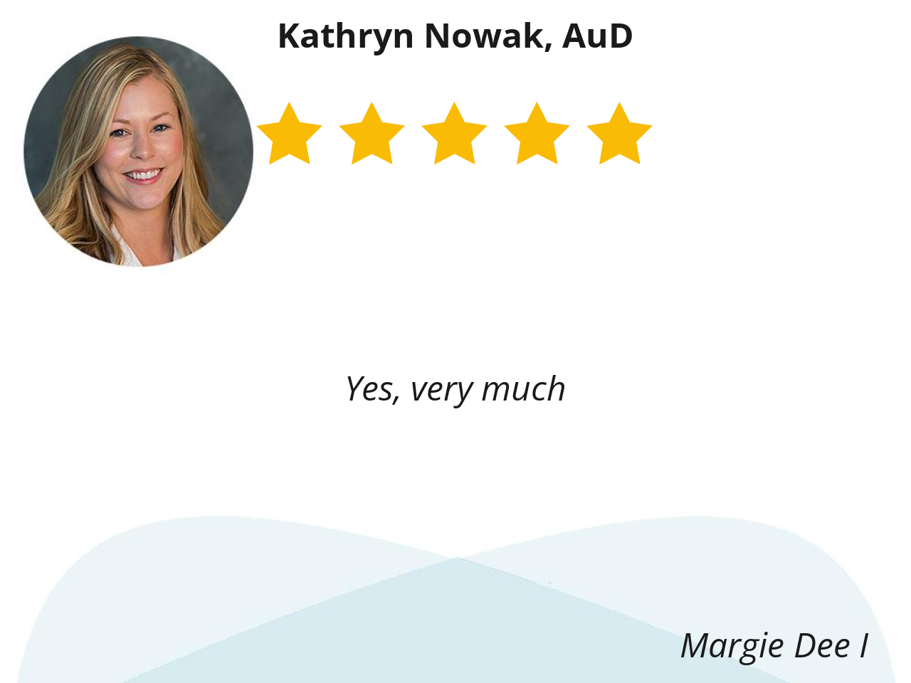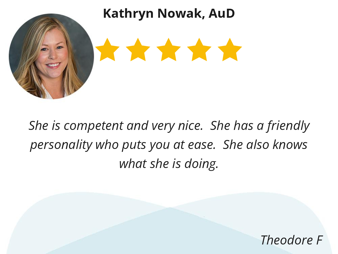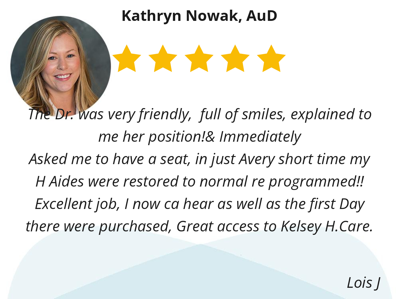 Dr. Nowak is a great doctor. When my hearing aids die, it is a major problem, and she always fits me in to make it possible for me to hear again. Katie Nowak is an important ambassador for excellence at Kelsey.