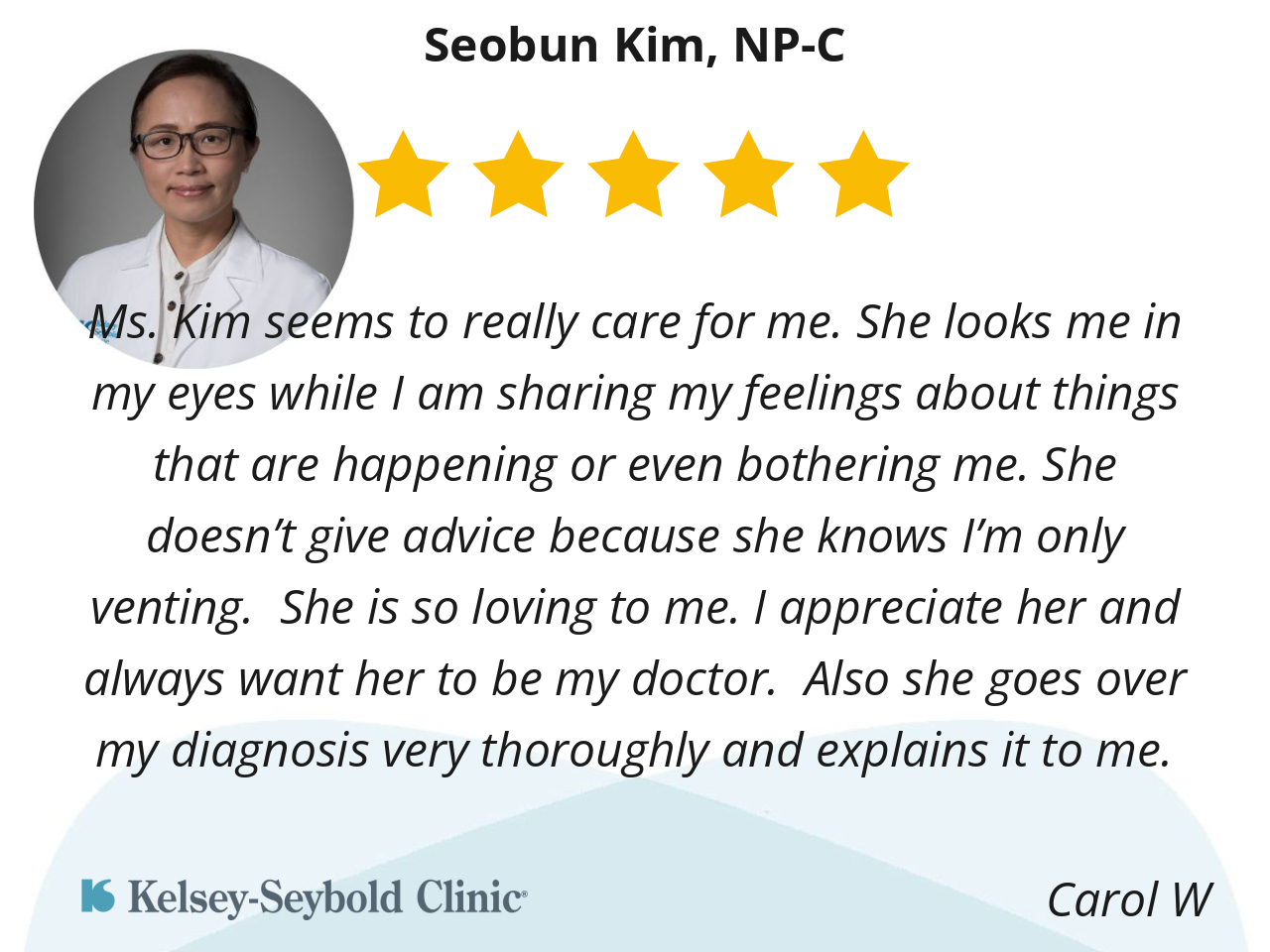 Ms. Kim seems to really care for me. She looks me in my eyes while I am sharing my feelings about things that are happening or even bothering me. She doesn’t give advice because she knows I’m only venting. She is so loving to me. I appreciate her and always want her to be my doctor. Also she goes over my diagnosis very thoroughly and explains it to me.