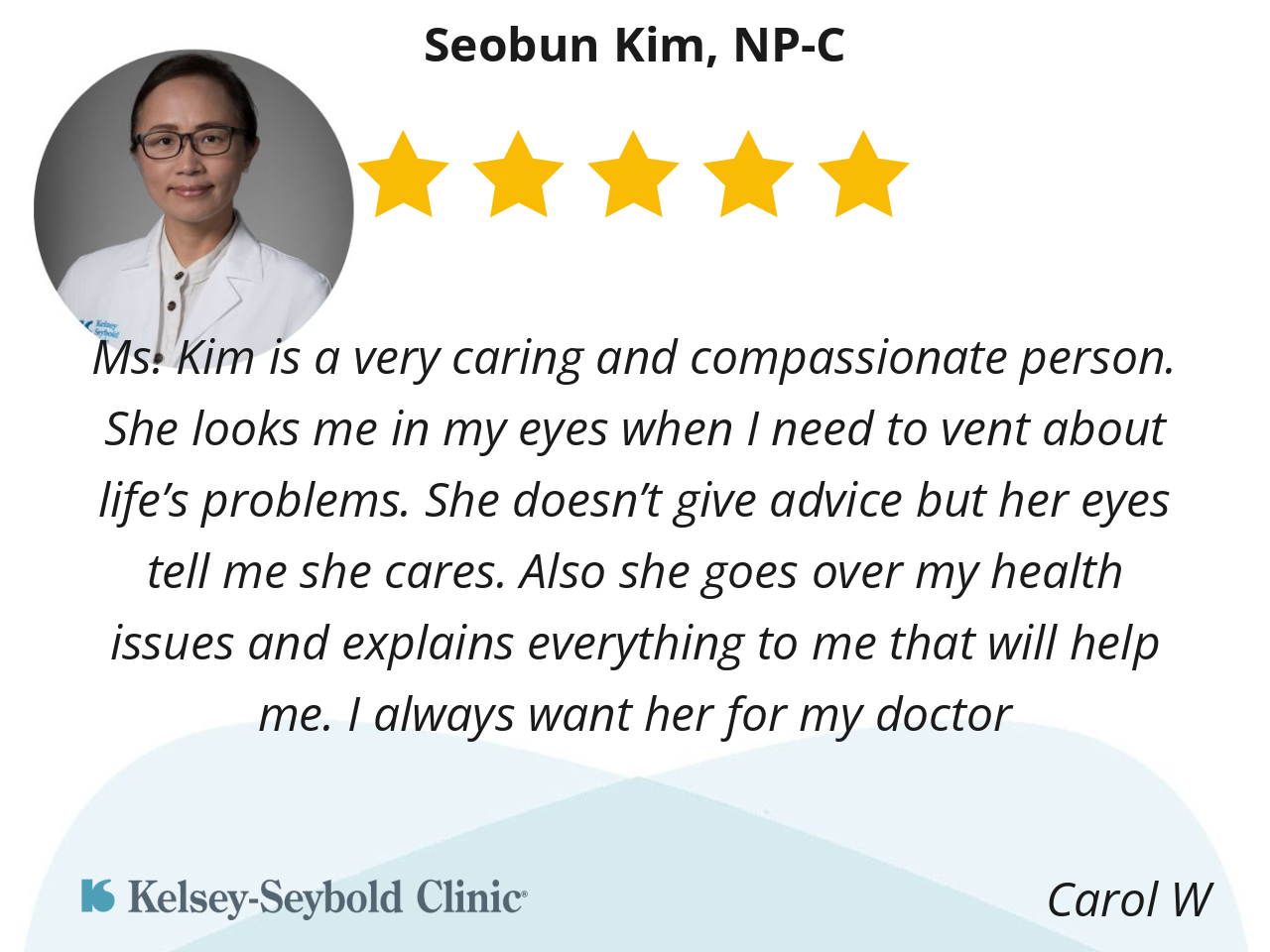 Ms. Kim is a very caring and compassionate person. She looks me in my eyes when I need to vent about life’s problems. She doesn’t give advice but her eyes tell me she cares. Also she goes over my health issues and explains everything to me that will help me. I always want her for my doctor