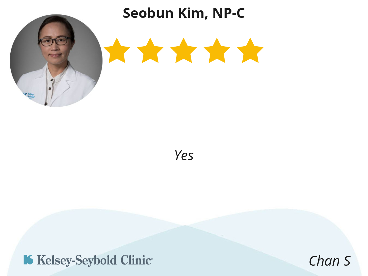 Kim Seobun NP-C is very patient oriented. She made me feel comfortable expressing my concerns. She listened and gave me good feedback on my situation.