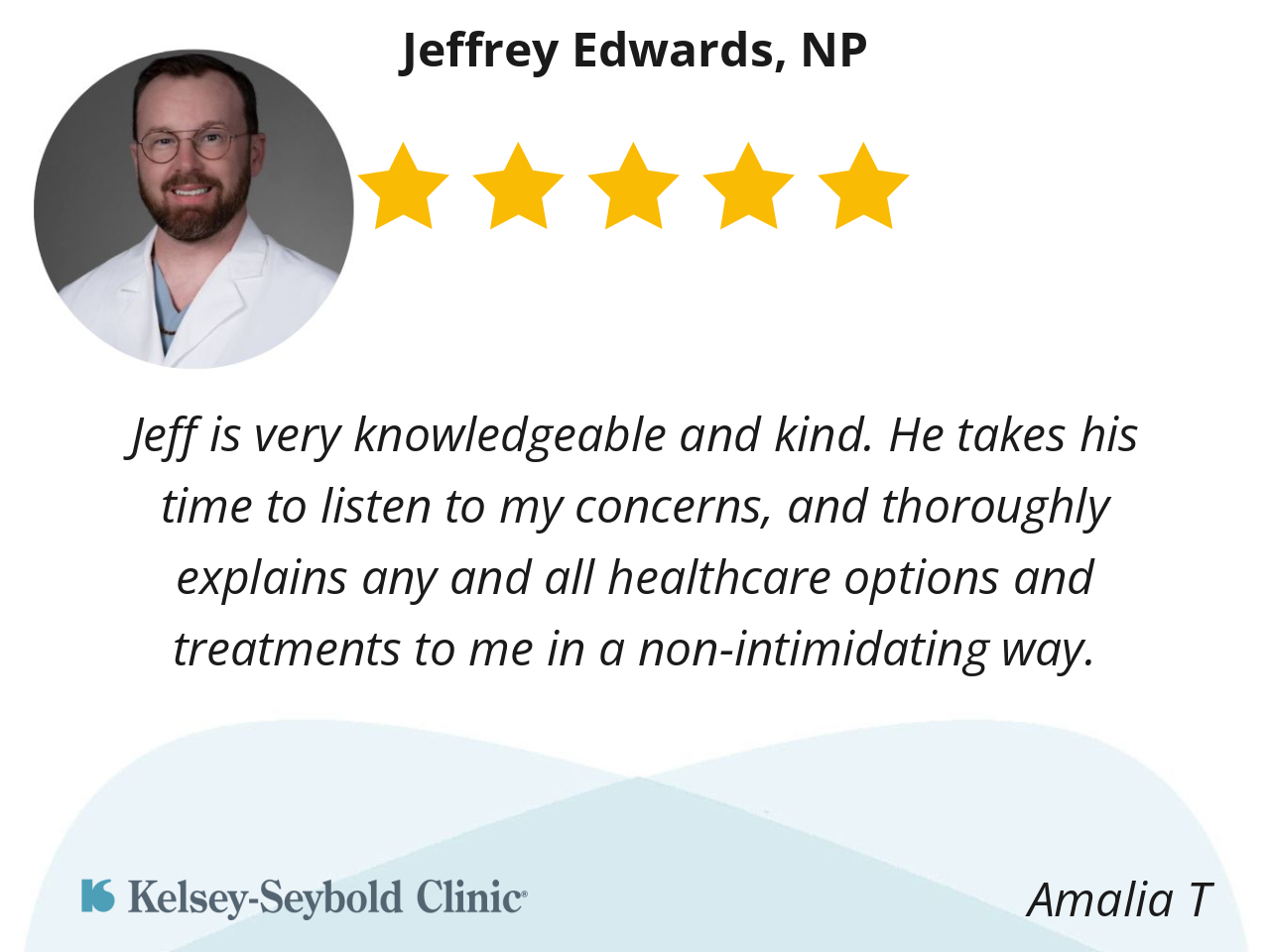 Dr. Jeffrey Edwards at is truly exceptional! He takes his time with every visit and genuinely listens. I’ve never felt rushed or like I was asking a "dumb" question—he answers everything thoroughly and openly, with so much care and patience. It’s rare to find a doctor who makes you feel like you’re getting true one-on-one attention. His follow-ups and concern for your well-being go above and beyond. I’d give him 1,000 stars if I could!
