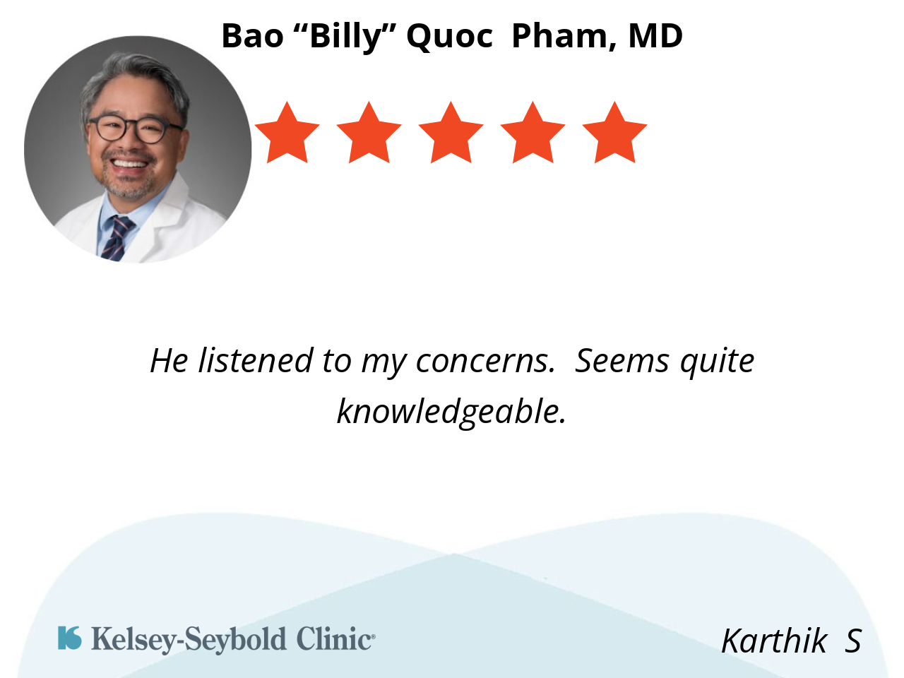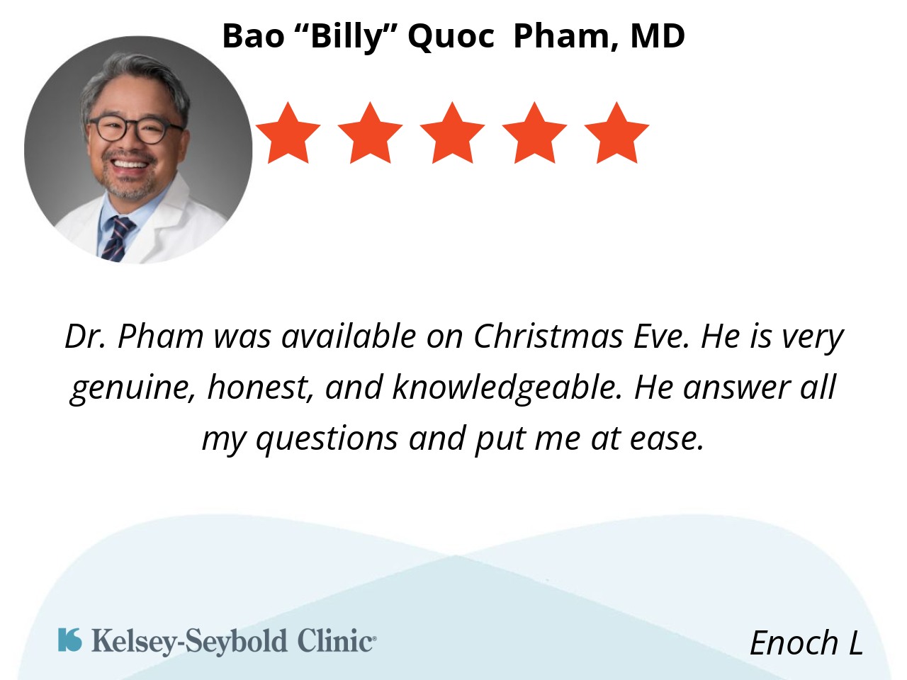 Dr. Pham was available on Christmas Eve. He is very genuine, honest, and knowledgeable. He answer all my questions and put me at ease.