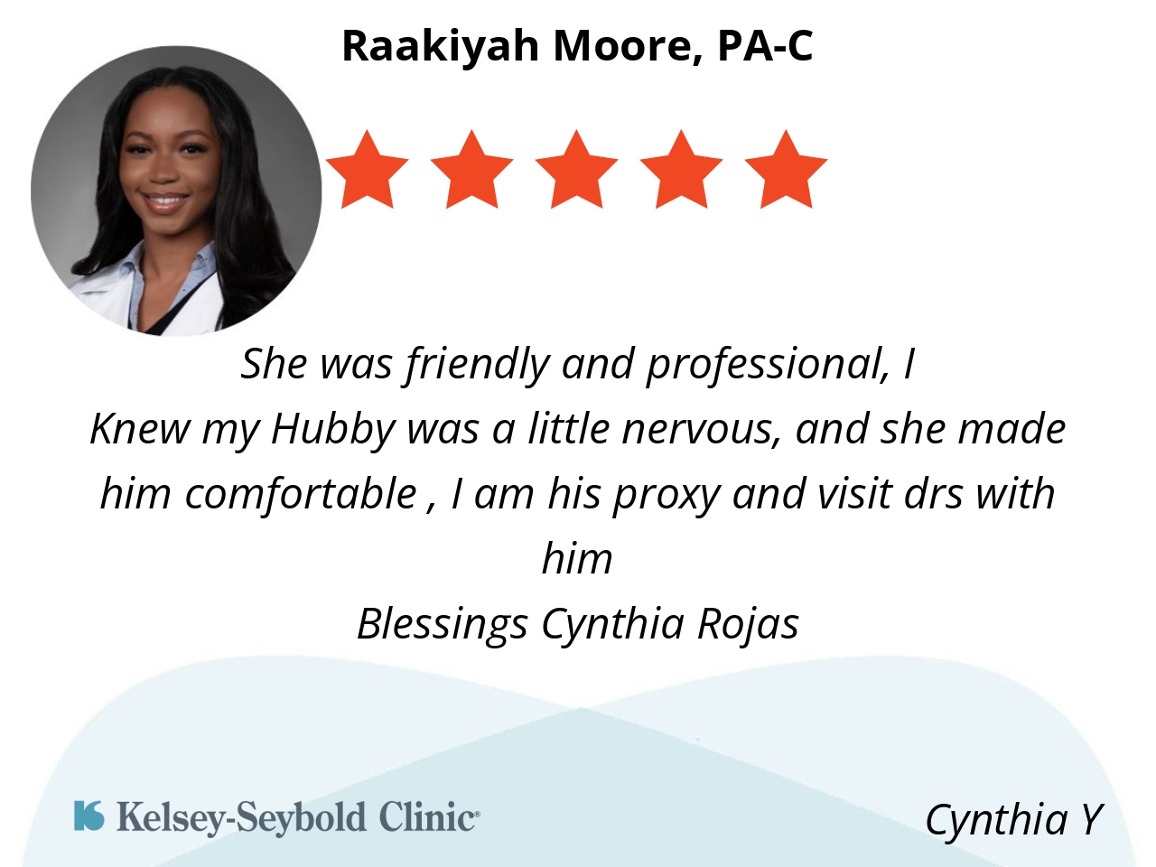 Knew my Hubby was a little nervous, and she made him comfortable , I am his proxy and visit drs with him