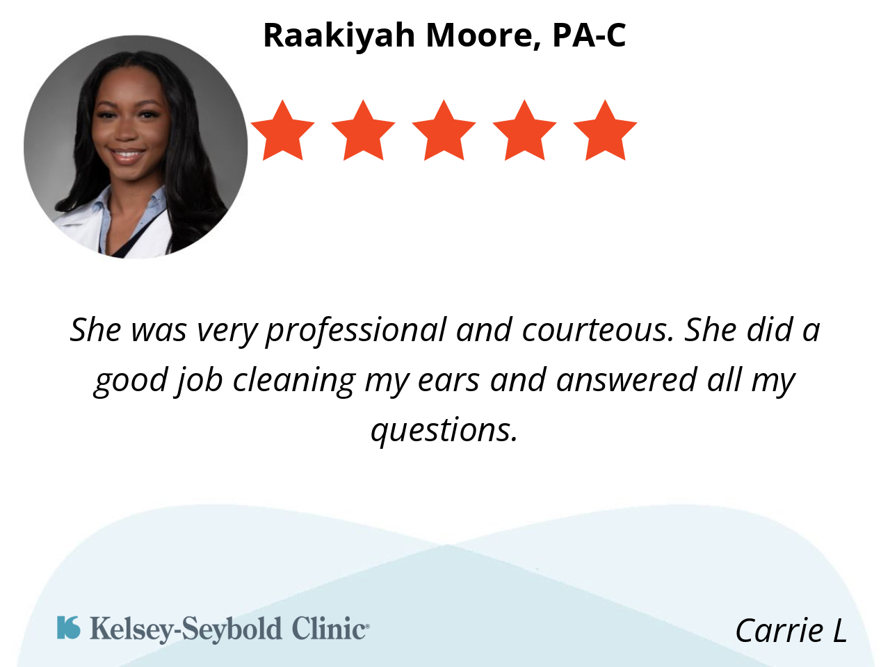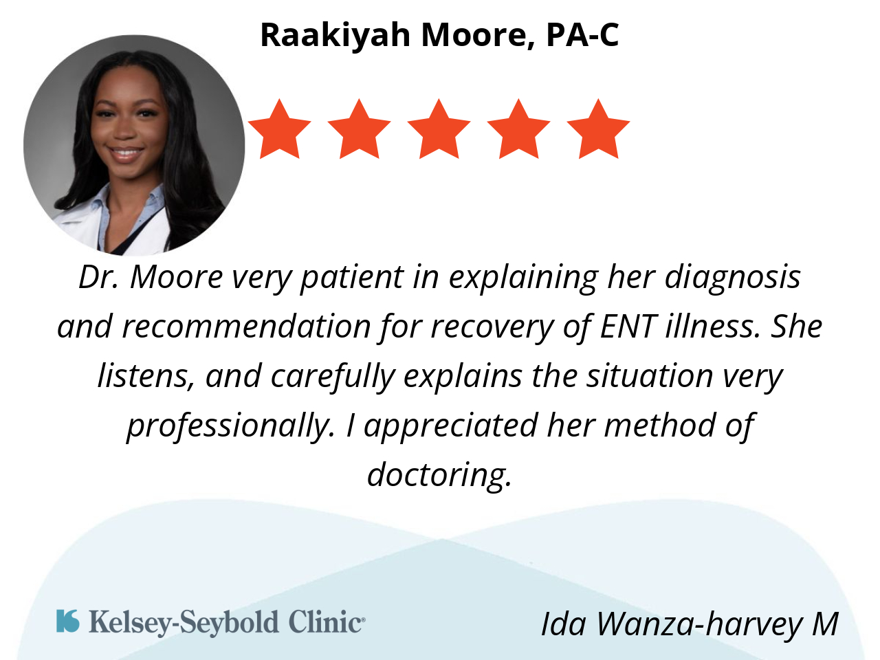 Dr. Moore very patient in explaining her diagnosis and recommendation for recovery of ENT illness. She listens, and carefully explains the situation very professionally. I appreciated her method of doctoring.