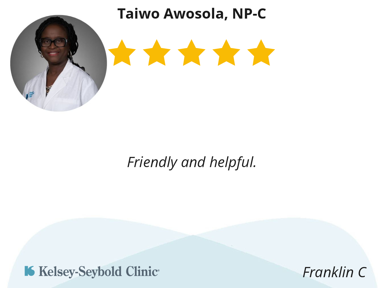 Nurse Awosola was very cordial and concerned about my medical issues. She gave me a sense of empathy during our visit. Nurse Awosola was very positive example of the quality of care offered by Kelsey-Seybold.