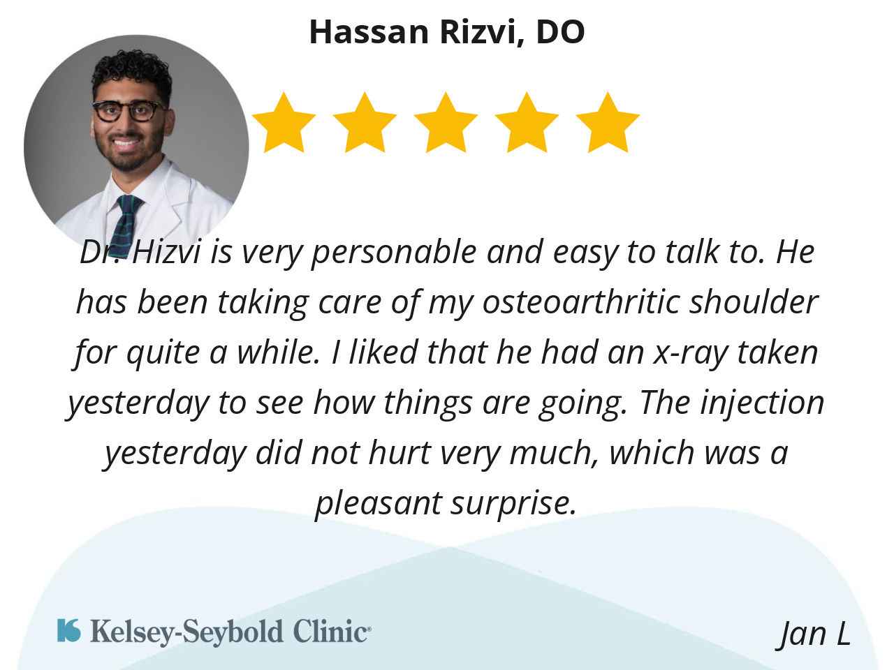 Dr. Hizvi is very personable and easy to talk to. He has been taking care of my osteoarthritic shoulder for quite a while. I liked that he had an x-ray taken yesterday to see how things are going. The injection yesterday did not hurt very much, which was a pleasant surprise.