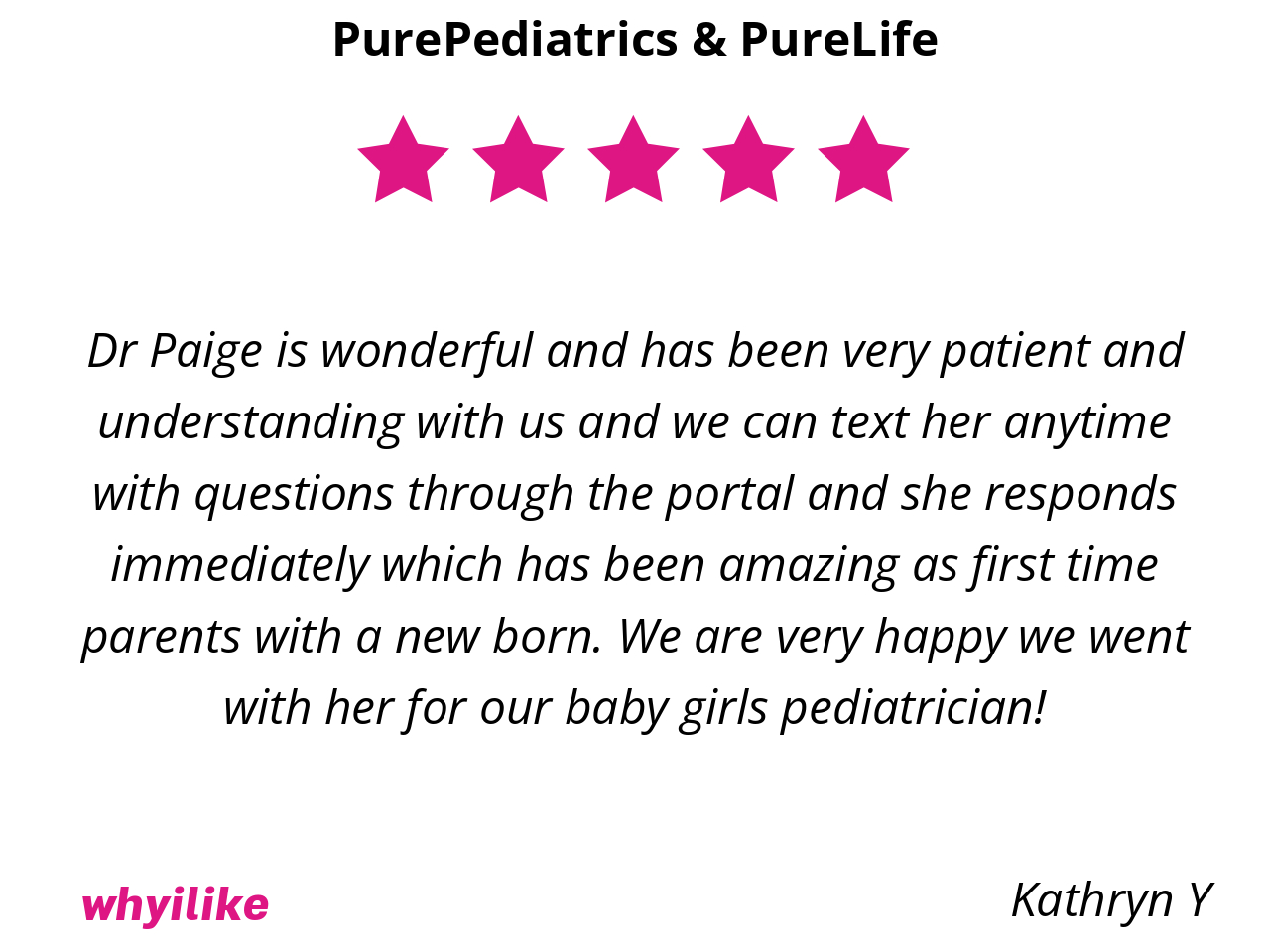 We recently just had our daughter and found PurePediatrics through a friend. We love Dr. Sam and how thorough and thoughtful she is. We are never rushed at our appointments and she spends time answering any and all questions, giving advice and sending resources after for us so we are always prepared for next milestones. I highly recommend them and we are so glad we found their office!