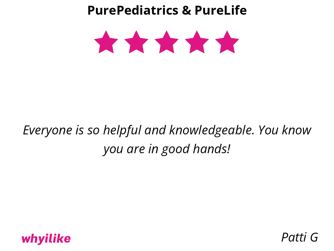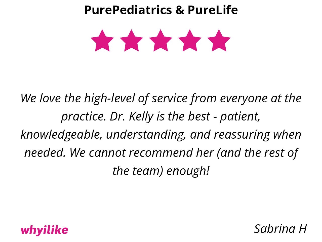 We started out at a different concierge pediatrician and found the physician to be rude and judgmental. Dr. Sam and Pure Pediatrics has been a breath of fresh air! She is kind, compassionate, but more importantly we trust her with our son’s care. We feel very grateful to have found Dr. Sam and Pure Pediatrics!