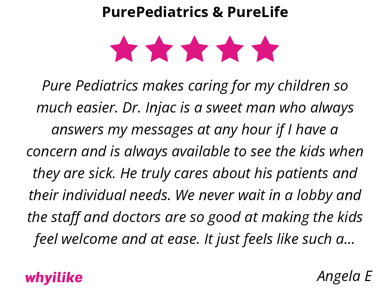 Pure Pediatrics makes caring for my children so much easier. Dr. Injac is a sweet man who always answers my messages at any hour if I have a concern and is always available to see the kids when they are sick. He truly cares about his patients and their individual needs. We never wait in a lobby and the staff and doctors are so good at making the kids feel welcome and at ease. It just feels like such a relief knowing we have Pure pediatrics looking after them. They are always very knowledgeable, thorough and come up with effective plans of care that are at times all natural and then medication if absolutely required. I trust the staff and doctors. I’m so grateful to have the comfort of their support. Totally worth the concierge fee and more. Would give 100 stars if I could, especially with a new born they have been even more helpful. Amazing!