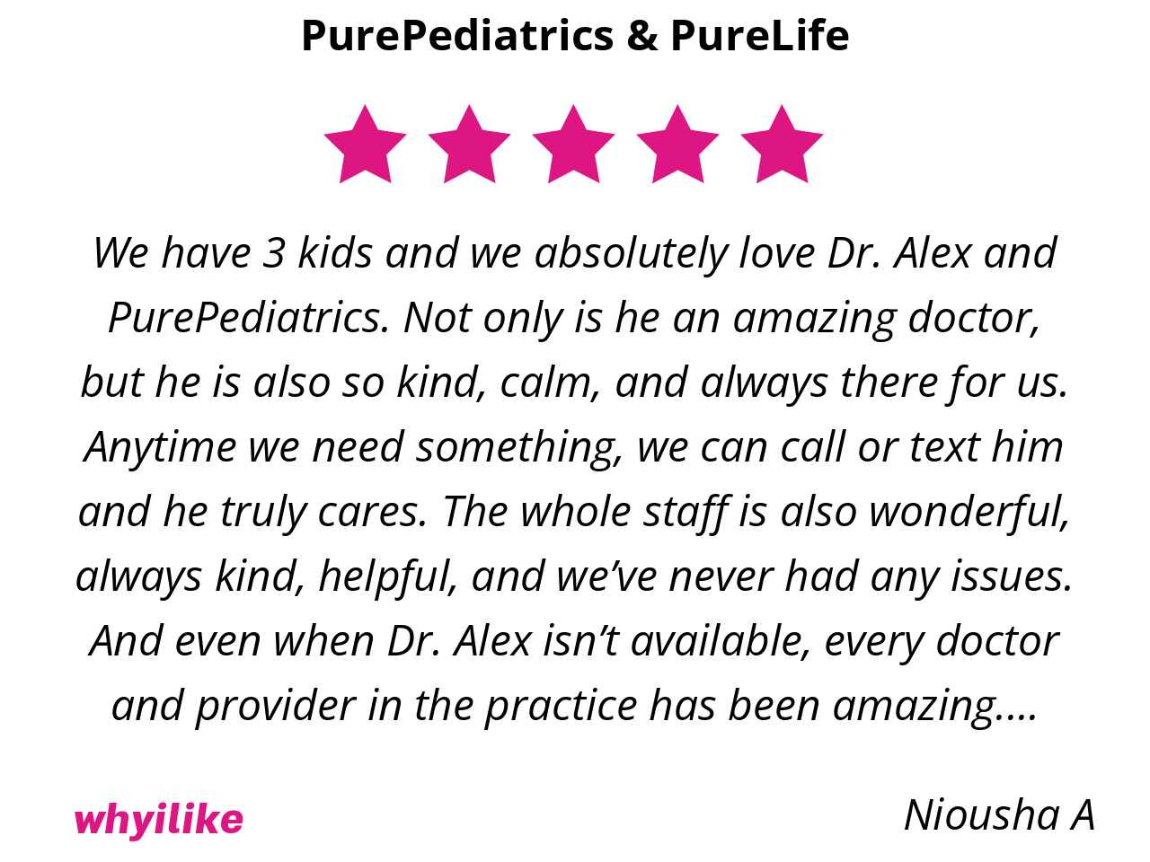We have 3 kids and we absolutely love Dr. Alex and PurePediatrics. Not only is he an amazing doctor, but he is also so kind, calm, and always there for us. Anytime we need something, we can call or text him and he truly cares. The whole staff is also wonderful, always kind, helpful, and we’ve never had any issues. And even when Dr. Alex isn’t available, every doctor and provider in the practice has been amazing. We’re very grateful for them