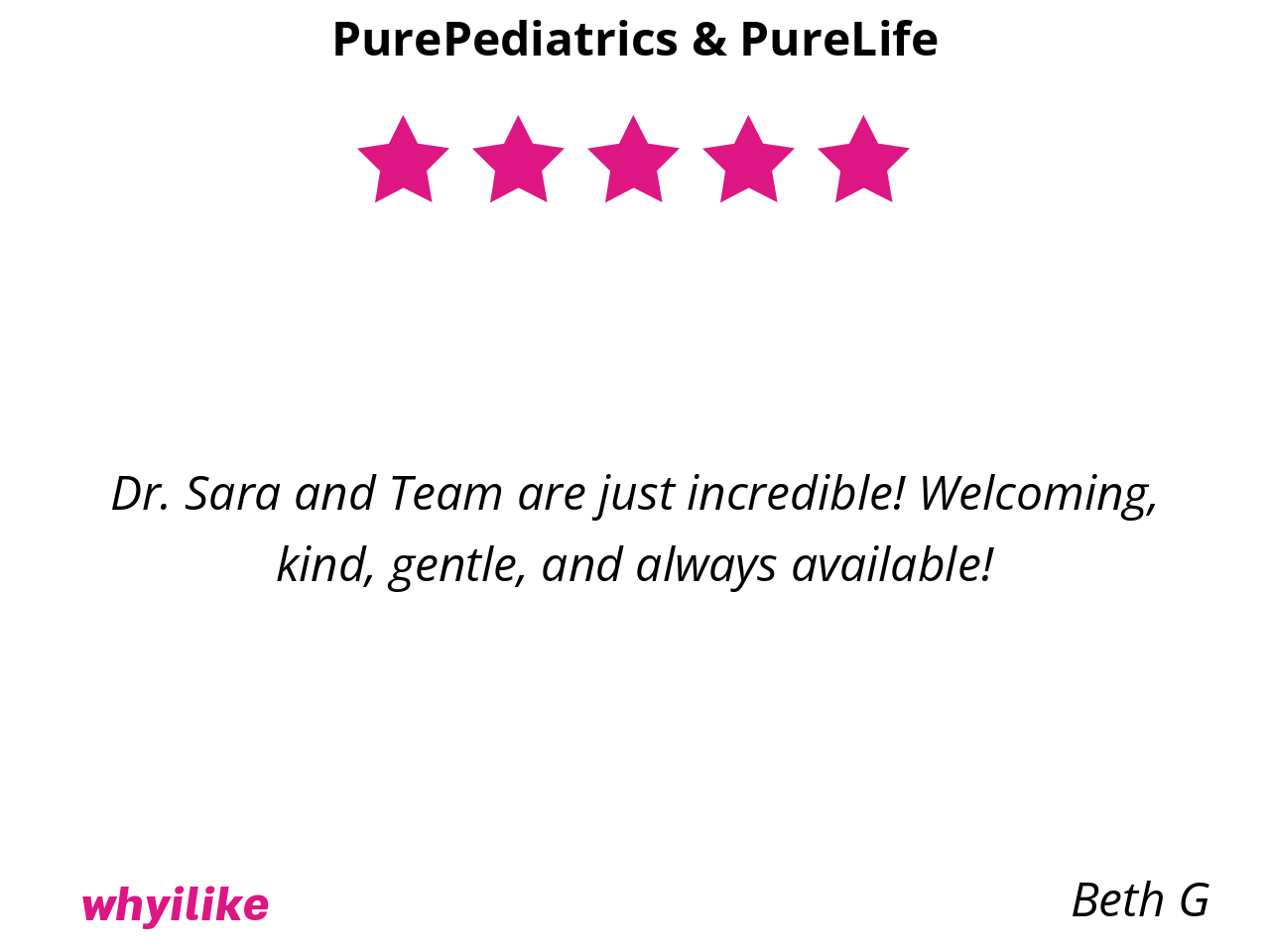 The entire team at PurePediatrics is wonderful too—organized, kind, and responsive. We feel so lucky to have found Dr. Sara and can’t imagine going anywhere else. Highly recommend to any parent looking for exceptional pediatric care!
