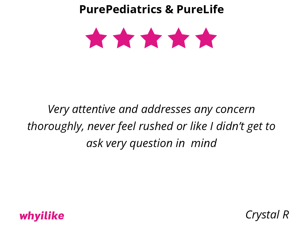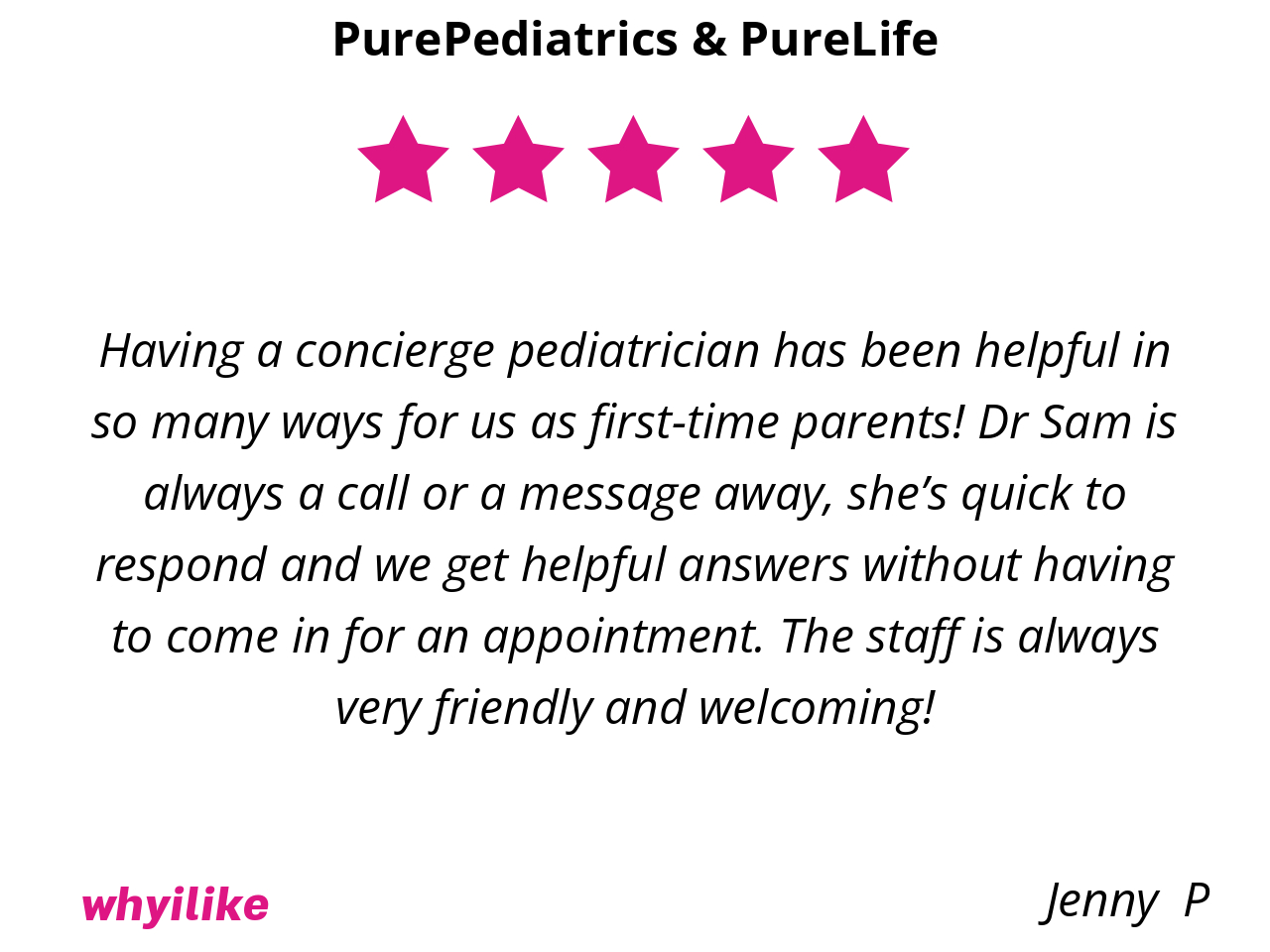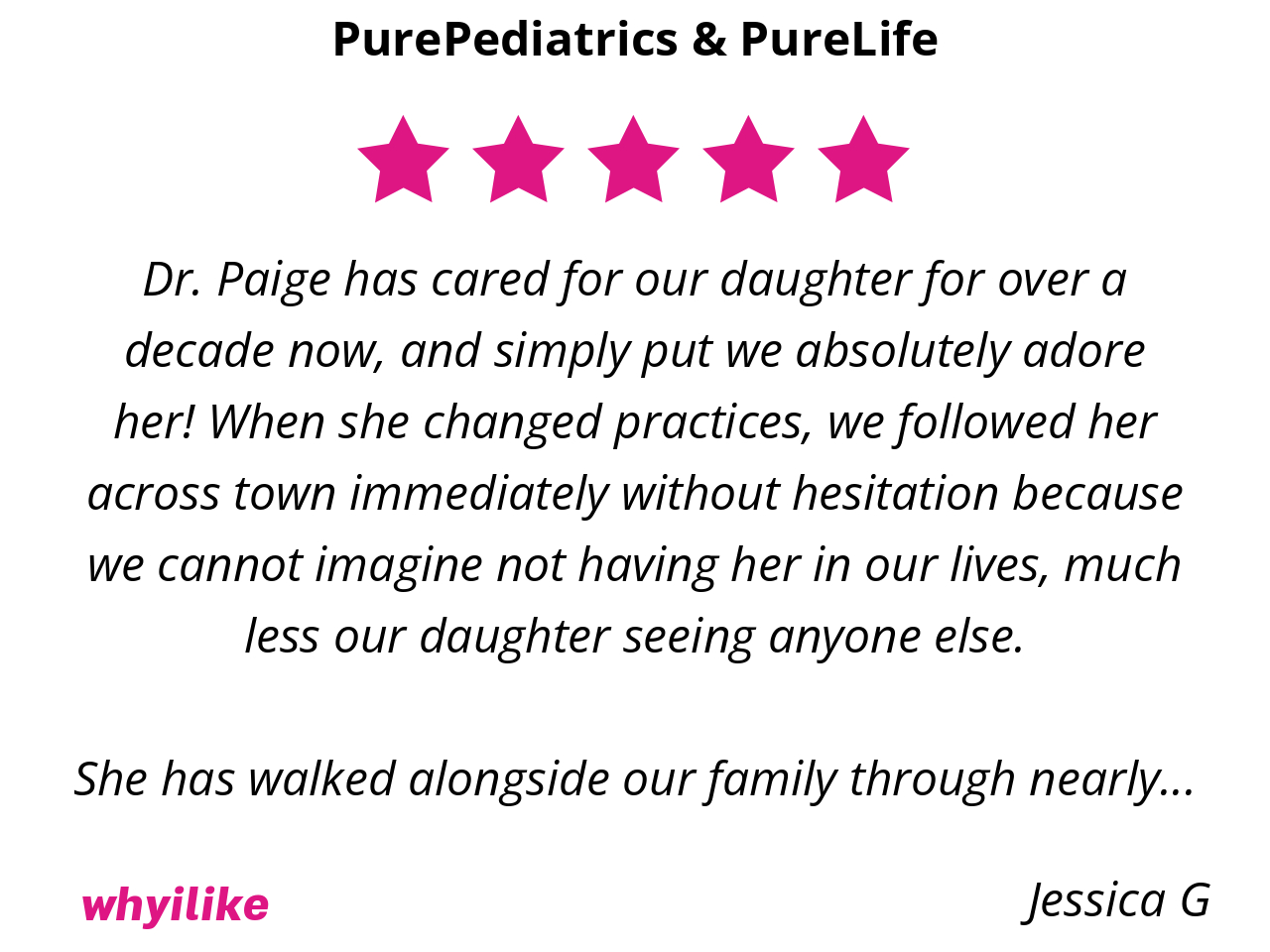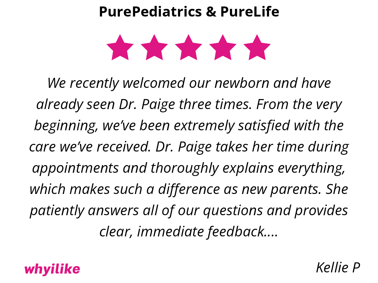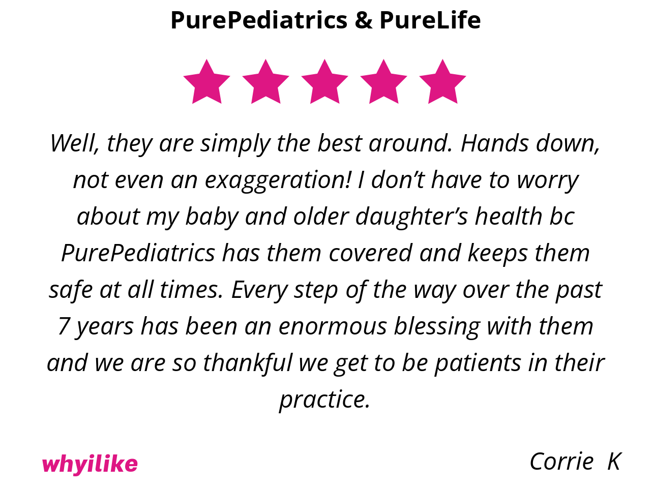 Well, they are simply the best around. Hands down, not even an exaggeration! I don’t have to worry about my baby and older daughter’s health bc PurePediatrics has them covered and keeps them safe at all times. Every step of the way over the past 7 years has been an enormous blessing with them and we are so thankful we get to be patients in their practice.