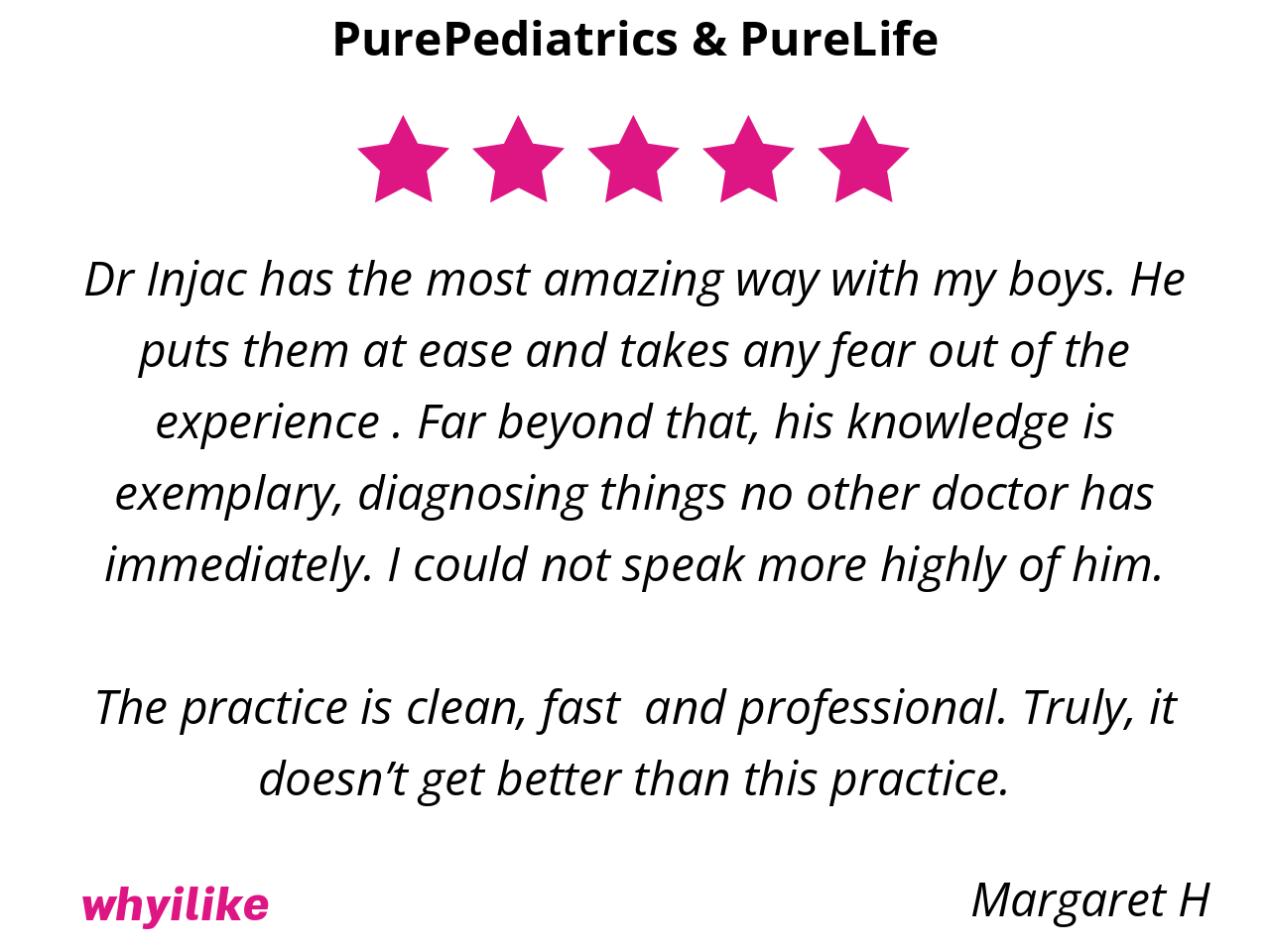Dr Injac has the most amazing way with my boys. He puts them at ease and takes any fear out of the experience . Far beyond that, his knowledge is exemplary, diagnosing things no other doctor has immediately. I could not speak more highly of him.