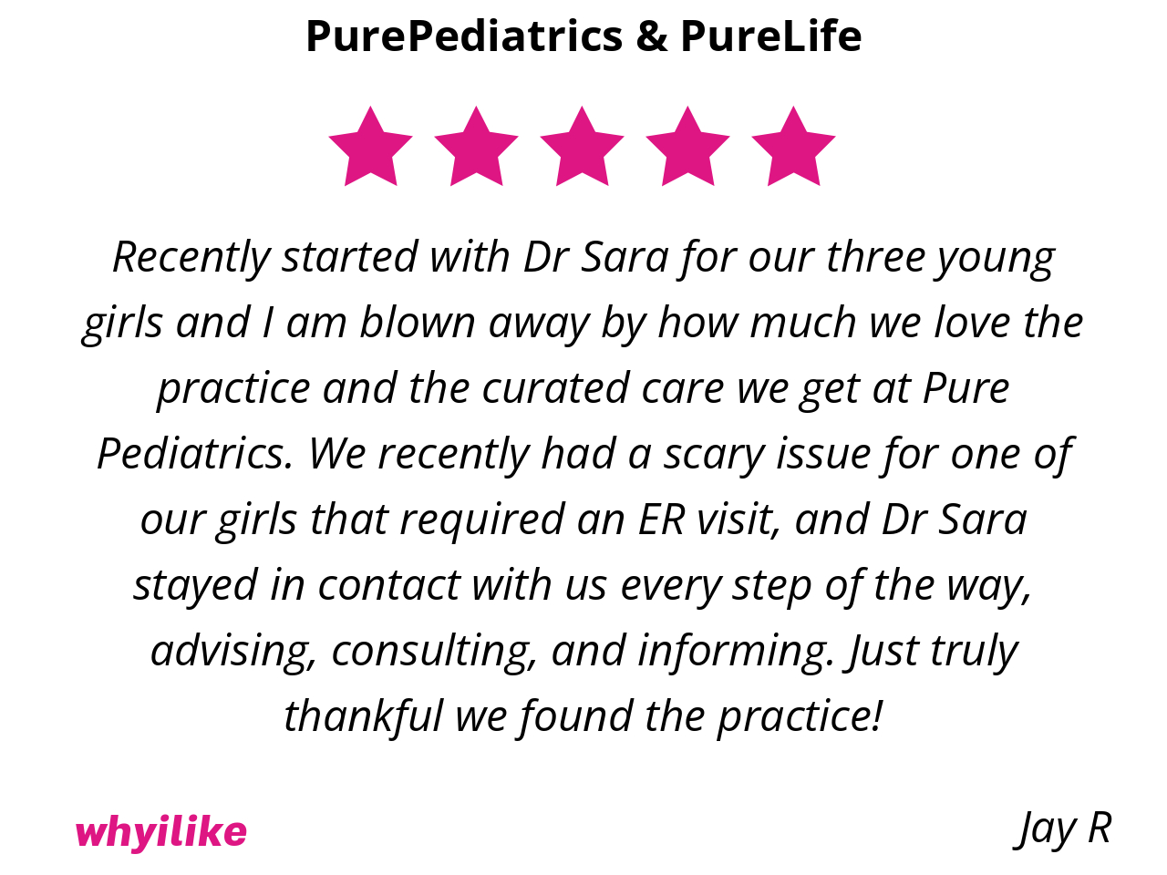 Recently started with Dr Sara for our three young girls and I am blown away by how much we love the practice and the curated care we get at Pure Pediatrics. We recently had a scary issue for one of our girls that required an ER visit, and Dr Sara stayed in contact with us every step of the way, advising, consulting, and informing. Just truly thankful we found the practice!