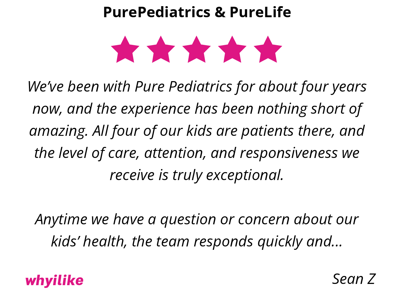 We’ve been with Pure Pediatrics for about four years now, and the experience has been nothing short of amazing. All four of our kids are patients there, and the level of care, attention, and responsiveness we receive is truly exceptional.