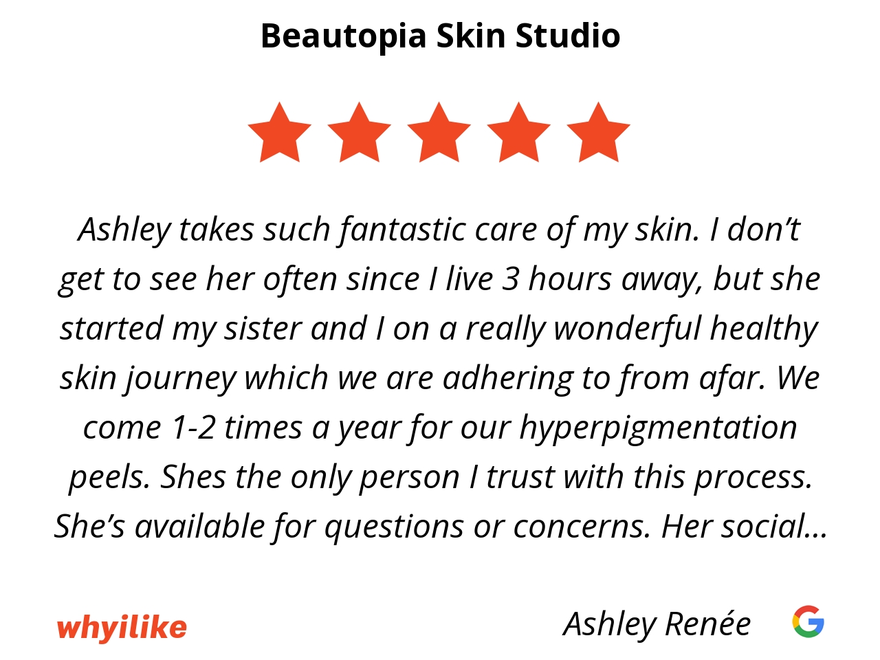 Ashley is truly a skincare magician! I came to Beautopia struggling with stubborn acne, and after working with her, my skin has completely transformed. She took the time to understand my skin’s needs, recommended the perfect treatments and products, and educated me every step of the way. Her studio is absolutely gorgeous. So calming and welcoming.