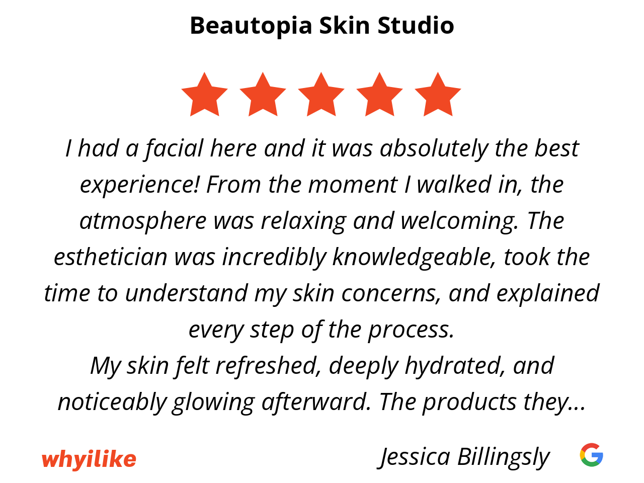 I’ve been going to Ashely’s Beautopia Skin Studio since 2016, and couldn’t imagine trusting anyone else at this point for my aesthetic services needs. Beautopia has every possible treatment to achieve glowing, radiant skin, and all of the technicians are not only knowledgeable and professional, but lovely people as well. They’re always adding new services, treatments, products, and packages, and it’s truly become my one-stop-shop for all my skincare needs. So grateful for the last decade of beautiful skin thanks to Beautopia, and looking forward to being a customer for many more years to come. 🥰