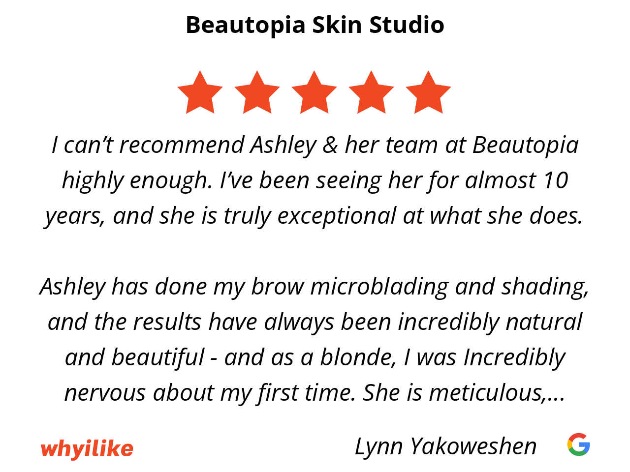 I can’t recommend Ashley & her team at Beautopia highly enough. I’ve been seeing her for almost 10 years, and she is truly exceptional at what she does.
