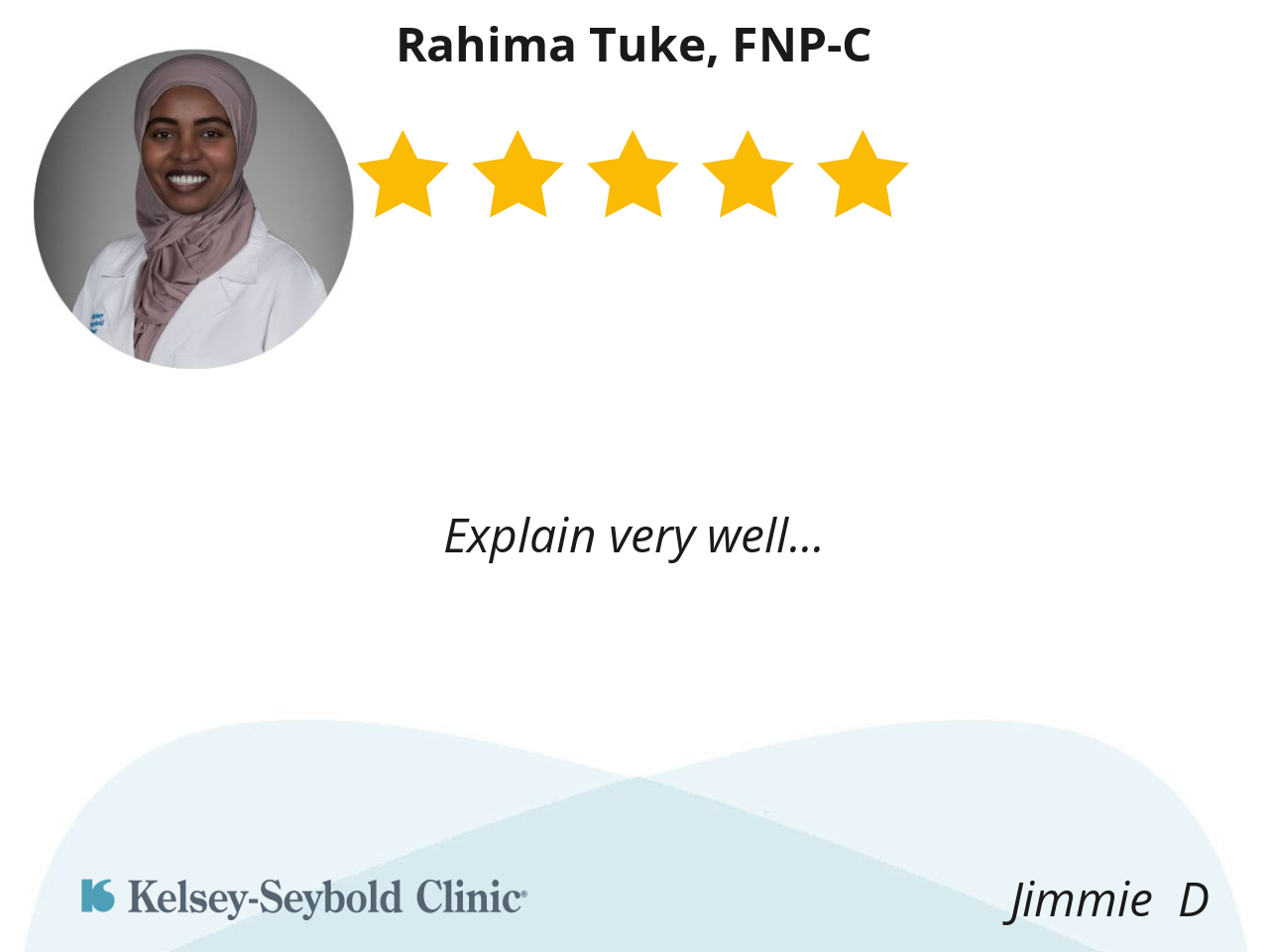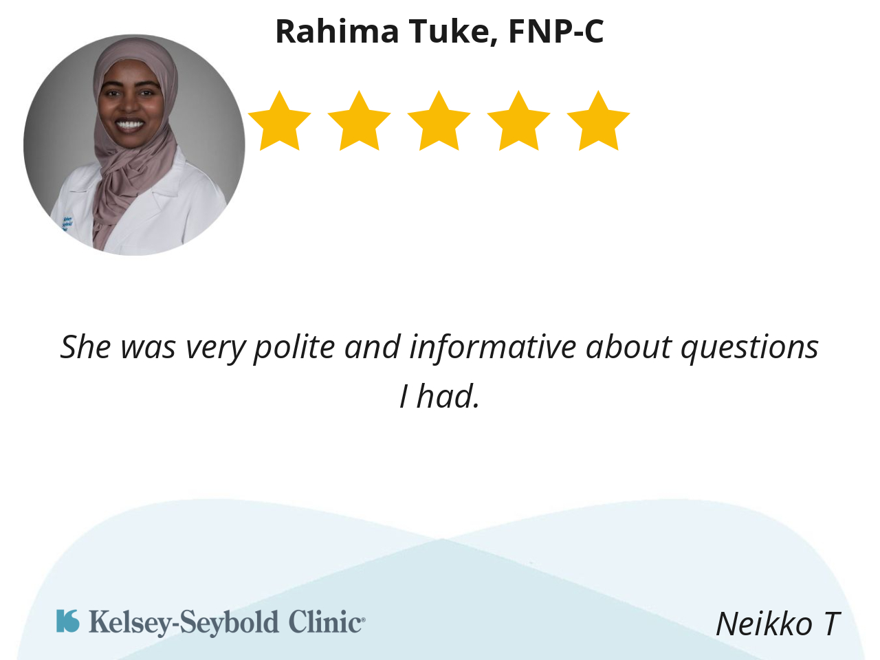 She is professional, listened to my concerns, wait time was minimal and seems to care about patients.