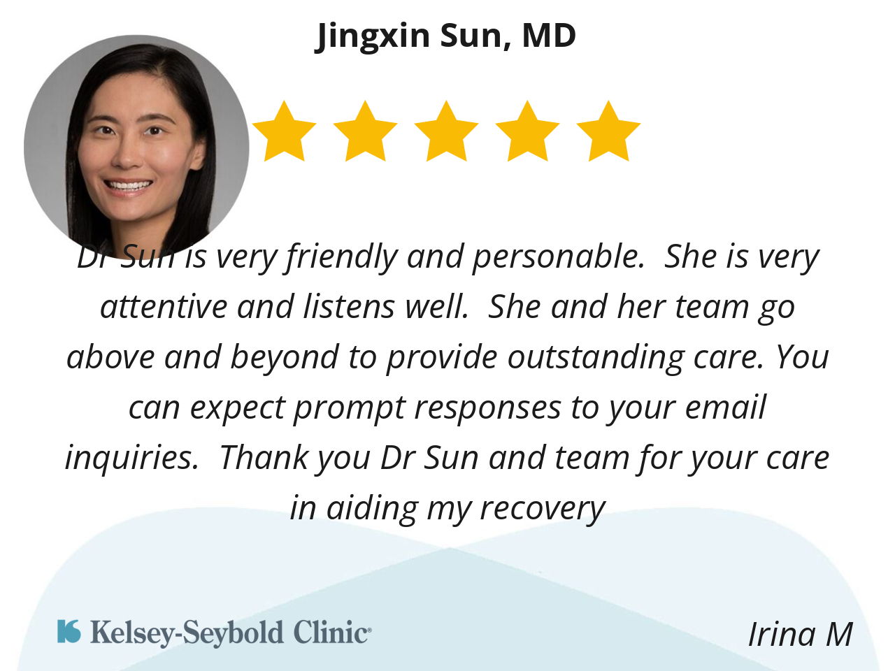 Dr Sun is very friendly and personable. She is very attentive and listens well. She and her team go above and beyond to provide outstanding care. You can expect prompt responses to your email inquiries. Thank you Dr Sun and team for your care in aiding my recovery