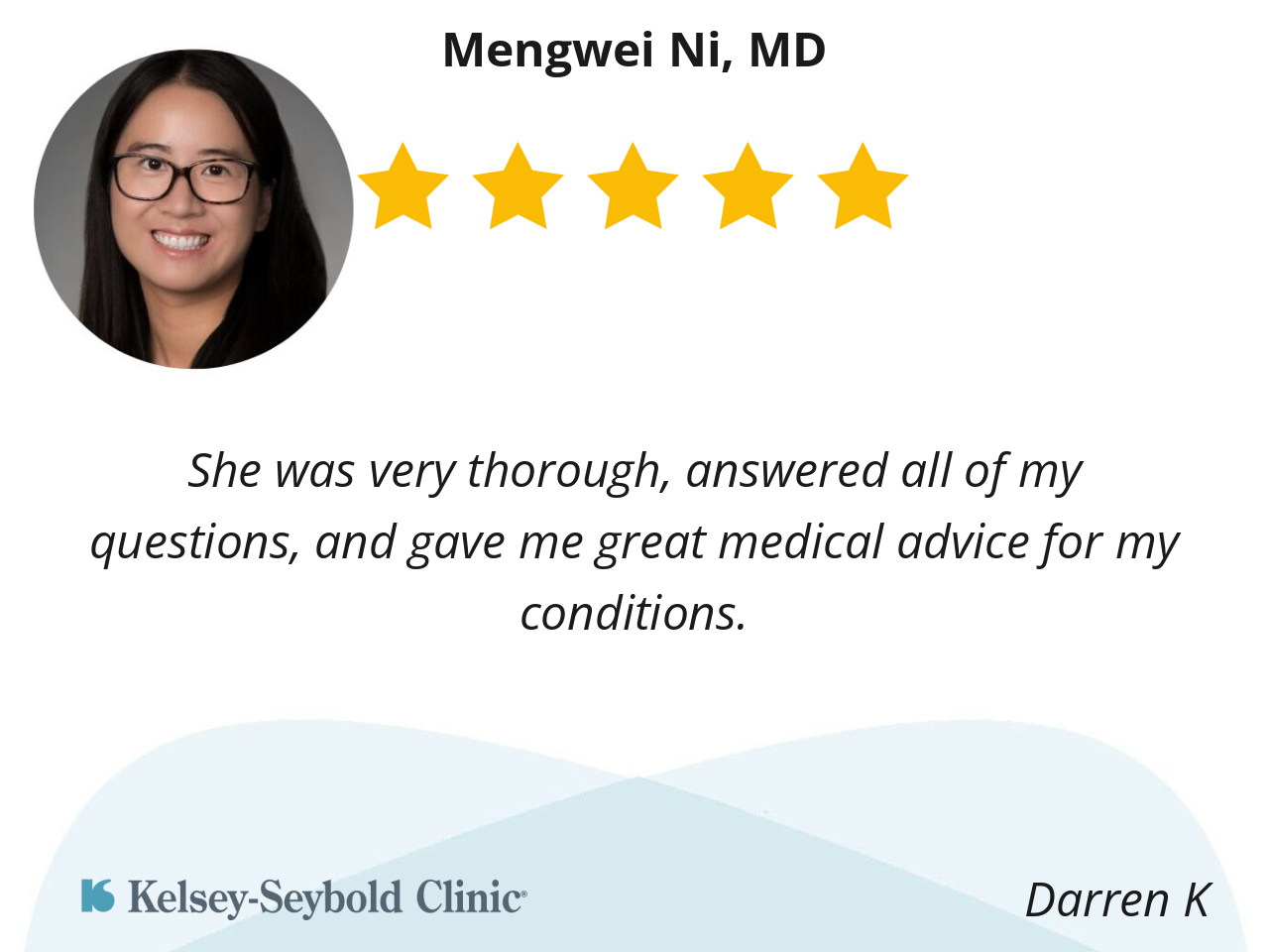 I liked Dr. Ni because she listened and explained in a way I could understand. I didn’t feel rushed. I felt like she cared and wanted to find a solution.