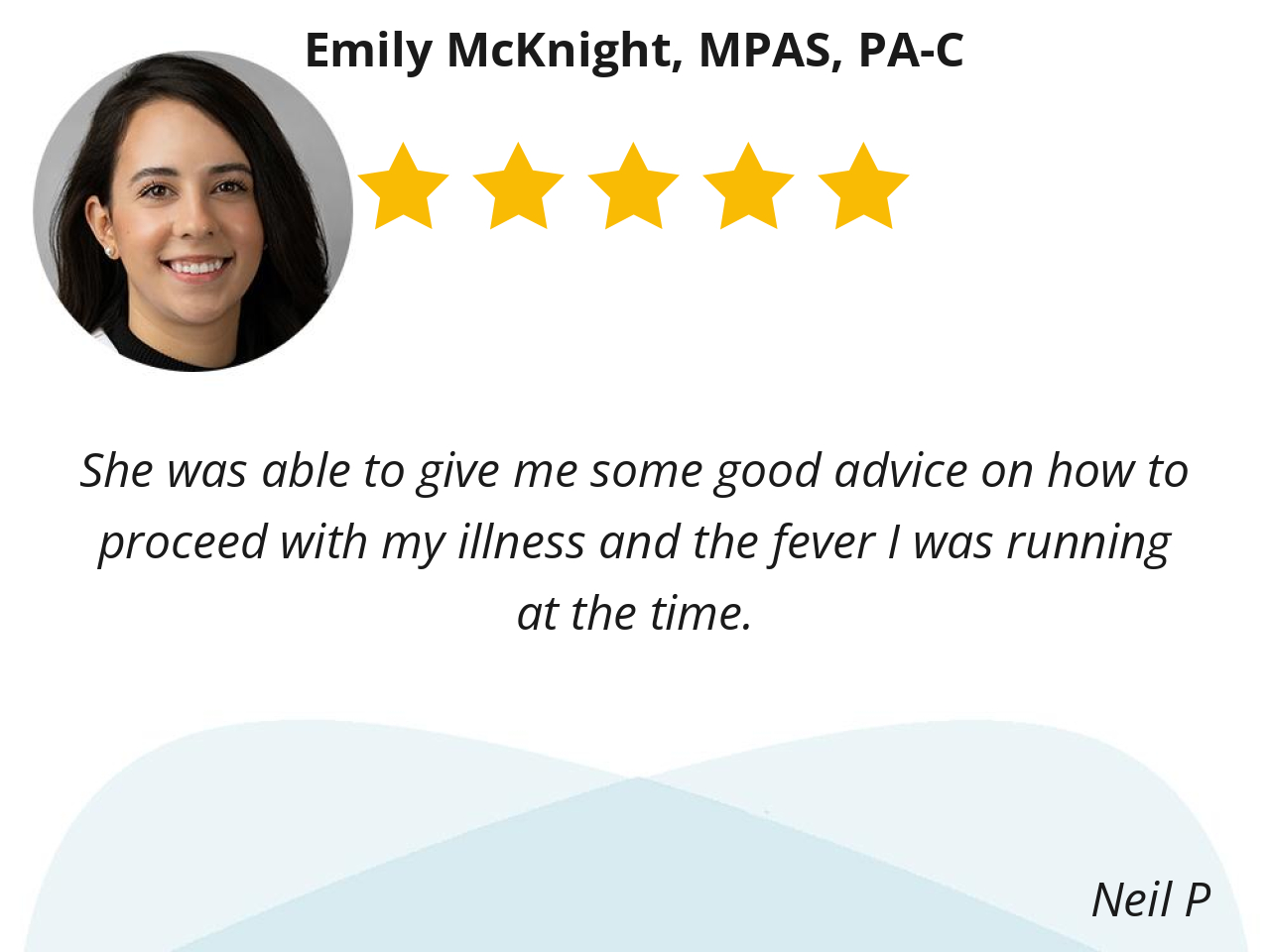 Emily McKnight was professional and courteous. She listened attentively and provided the assistance I required, for which I was most grateful. Also, I sincerely appreciate the assistance of RN June in Family Medicine at the Ft. Bend facility to accomplish this visit.