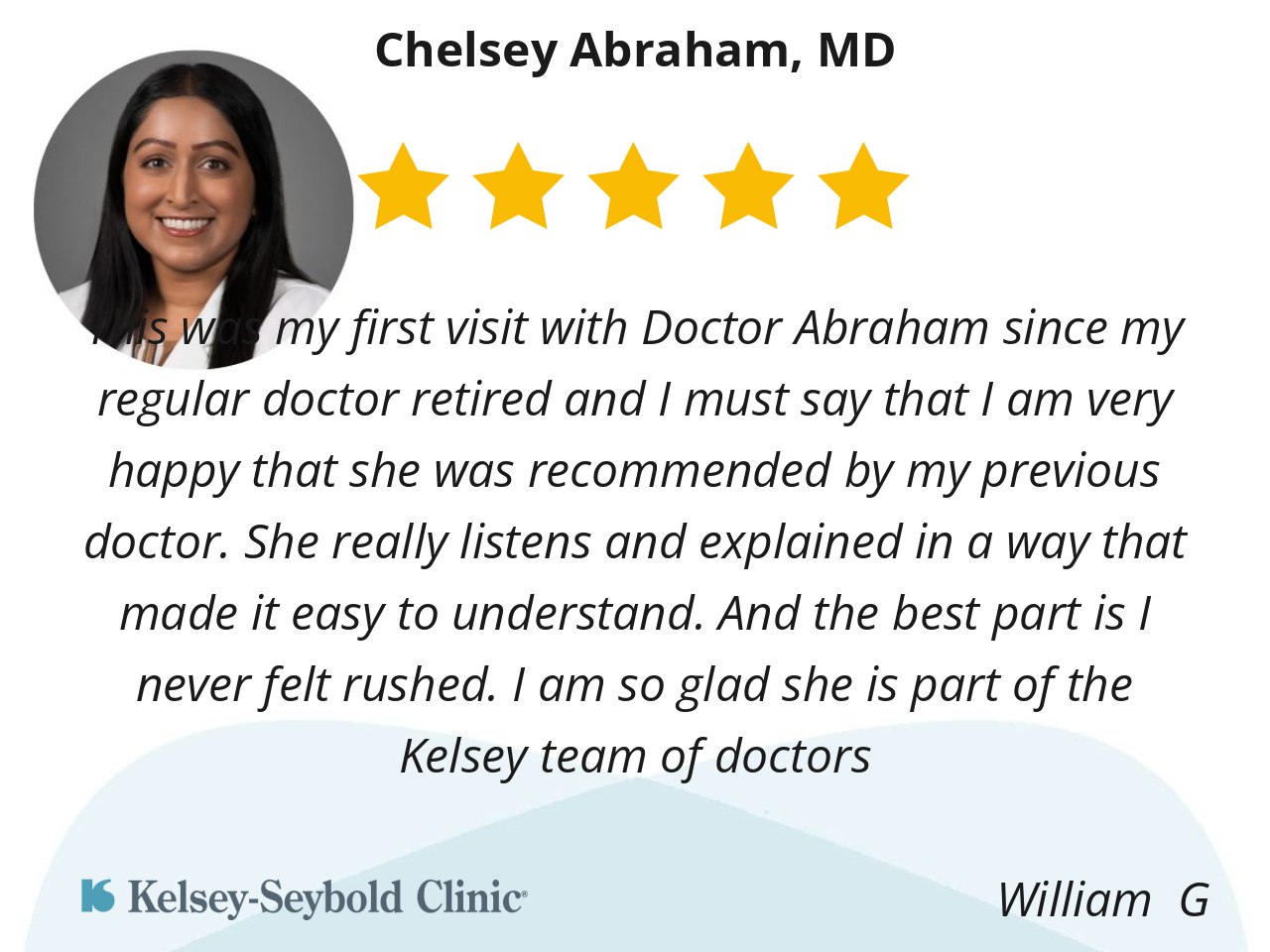 This was my first visit with Doctor Abraham since my regular doctor retired and I must say that I am very happy that she was recommended by my previous doctor. She really listens and explained in a way that made it easy to understand. And the best part is I never felt rushed. I am so glad she is part of the Kelsey team of doctors