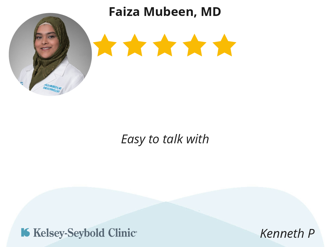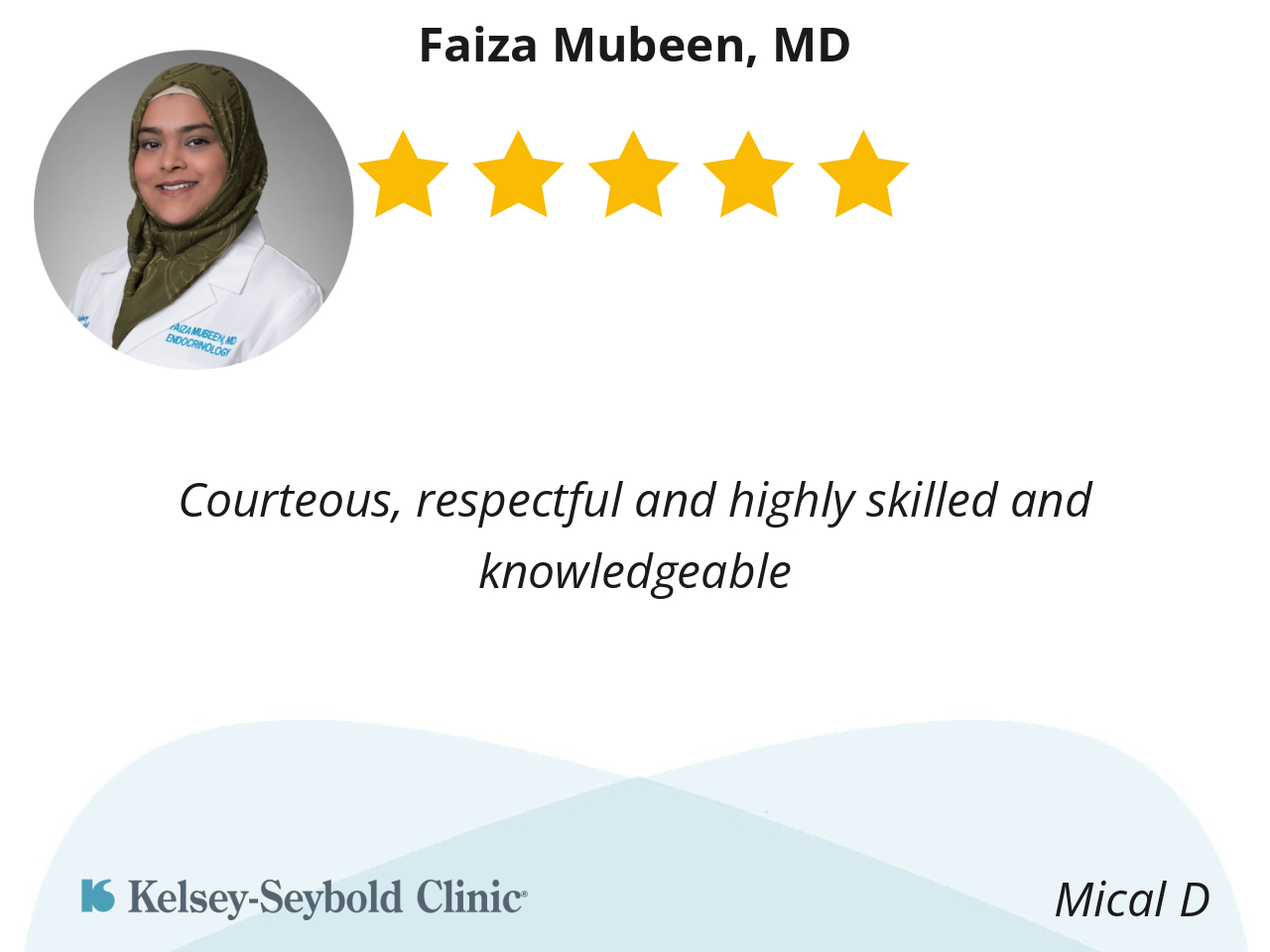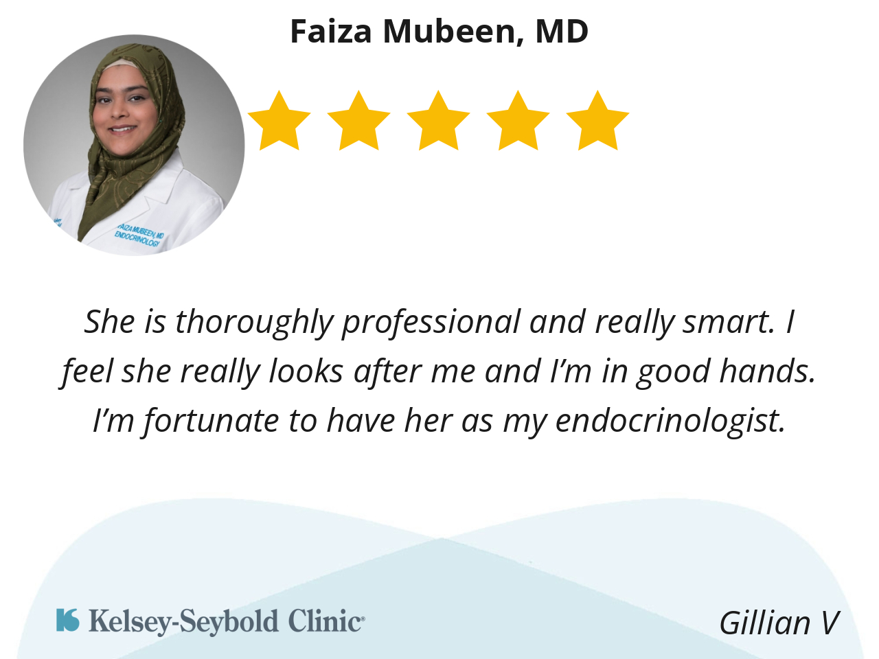 Dr. Mubeen is a warm, kind, friendly and knowledgeable doctor. She treats me as a partner in my healthcare and I appreciate that. She cares about me and I can actually feel that. She’s awesome.