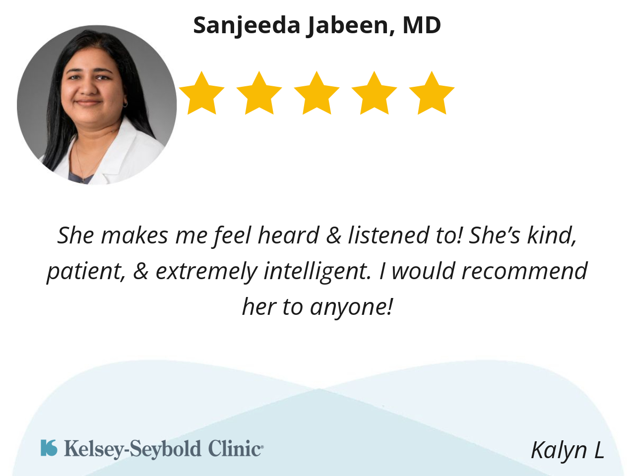 Dr. Jabeen was very attentive and through. Her demeanor was very calm and welcoming, and she took her during the evaluation. Additionally, outside of posting my test results on the app she called me to explain the results which not a lot of Drs. do anymore. This was a welcome surprise.