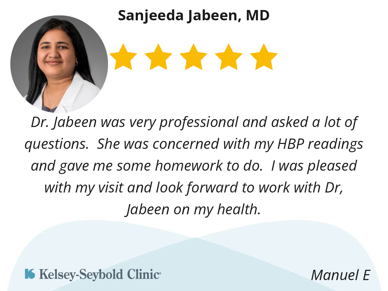 Dr. Jabeen was very professional and asked a lot of questions. She was concerned with my HBP readings and gave me some homework to do. I was pleased with my visit and look forward to work with Dr, Jabeen on my health.