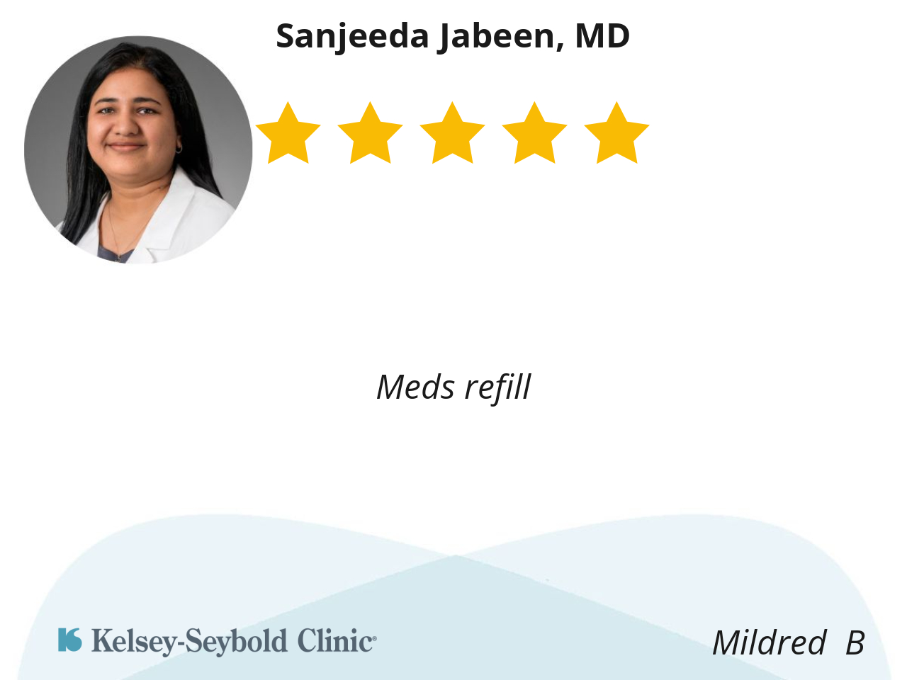 She’s good, calm and was pleasant. Dr Jabeen was compassionate and considerate.
