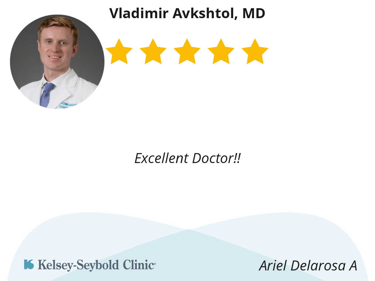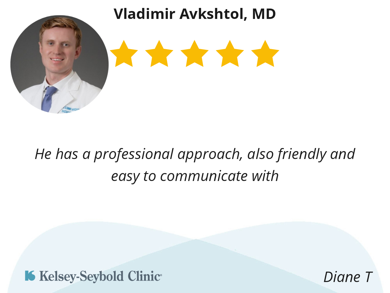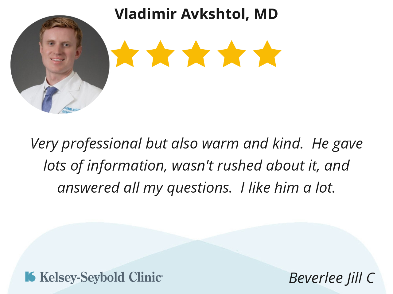 Dr. Avkshtol was extremely informative and knowledgeable about the information that he relayed to me. Pleased with his candidness and patience with me. He let me know if I had any questions or concerns to reach out. Just pleased overall with him and his nurse Vanessa. Calmed some of my fears and made me feel extremely comfortable about my treatment plan.