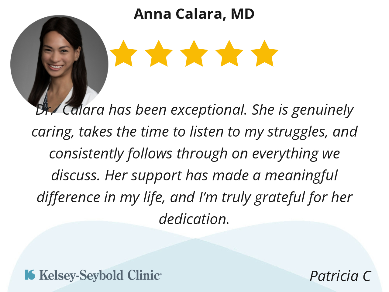 Dr. Calara has been exceptional. She is genuinely caring, takes the time to listen to my struggles, and consistently follows through on everything we discuss. Her support has made a meaningful difference in my life, and I’m truly grateful for her dedication.