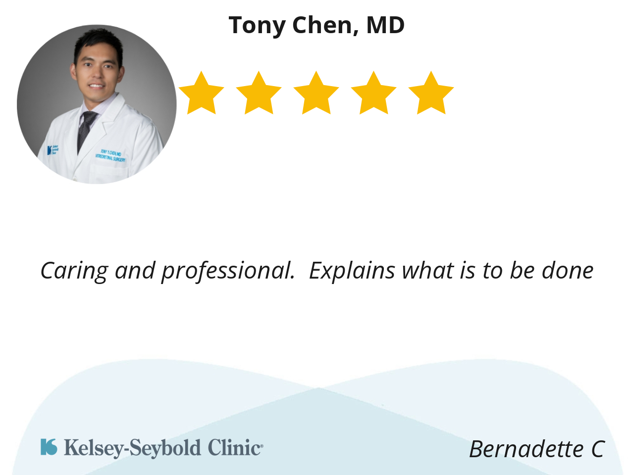 Dr Chen made me feel comfortable and he explained the procedure that I needed to have. I was a little nervous but he assured me that the procedure was one that would help me. I just want to let Dr Chen know that he is professional, great personality and explains things very well. Thank you Dr. Chen