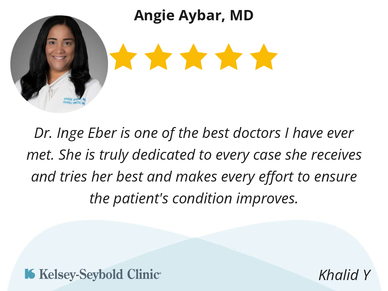 Dr. Angie Aybar phenomenal. Absolutely awesome. What I like most is personal. I never felt rushed. She genuinely cared about my health. Not only that, but she had very good and sound medical advice. Very capable and competent.