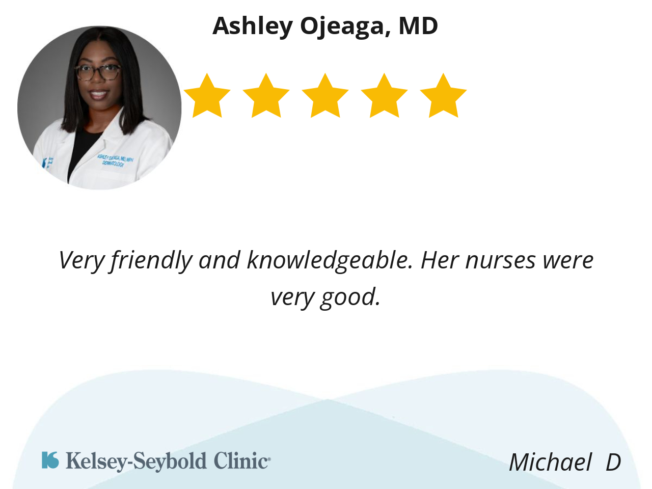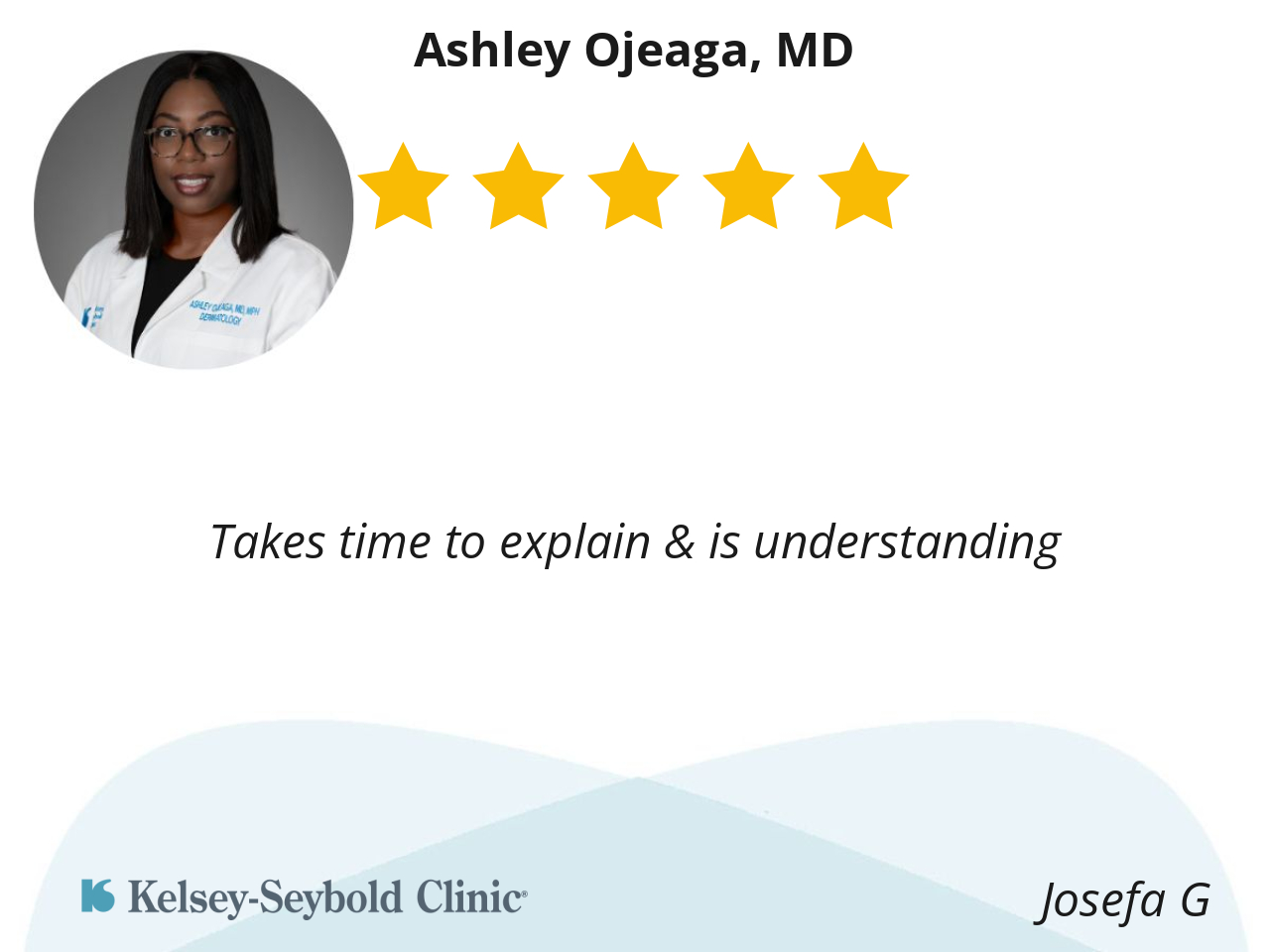 Dr. Ashley Ojeaga was professional and personable. She was patient and provided thorough answers to my questions. I would recommend Dr. Ojeaga to anyone looking for an awesome dermatologist.