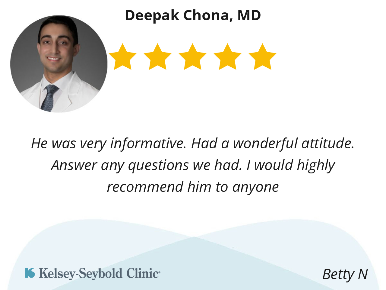 Dr. Chopa is very easy to talk with regarding one’s health issues. He has an effervescent attitude that is capable of perking up even me. His professional demeanor is one of high quality and standards, which makes it much easier for me to be a good patient and pay attention to his instructions.