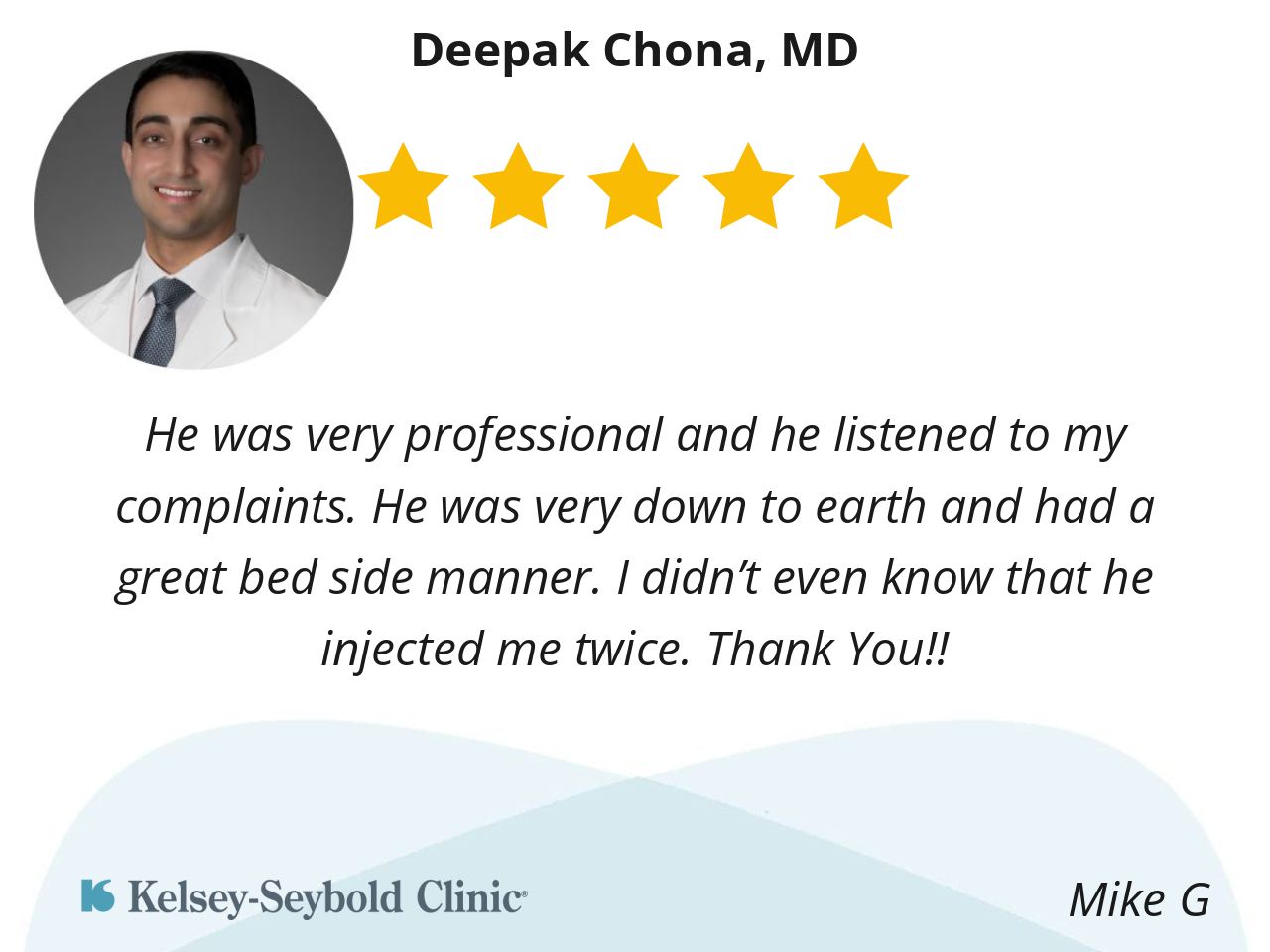 My whole Kelsey-Seybold experience was good. I arrived onetime and they saw me promptly. They kept me informed every step along the way. They were fast and efficient and honored my time. Dr. Chona listened to my explanation of my condition and did a great job of walking through the most likely causes and future treatment.