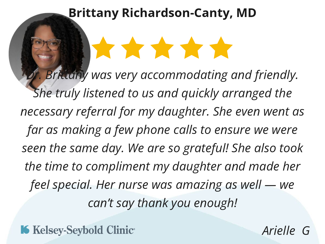 Dr. Brittany was very accommodating and friendly. She truly listened to us and quickly arranged the necessary referral for my daughter. She even went as far as making a few phone calls to ensure we were seen the same day. We are so grateful! She also took the time to compliment my daughter and made her feel special. Her nurse was amazing as well — we can’t say thank you enough!