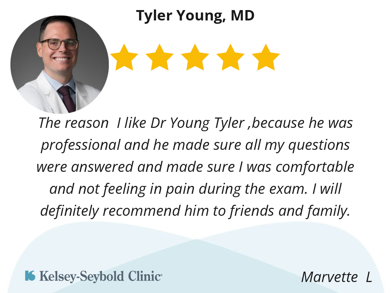 The reason I like Dr Young Tyler ,because he was professional and he made sure all my questions were answered and made sure I was comfortable and not feeling in pain during the exam. I will definitely recommend him to friends and family.