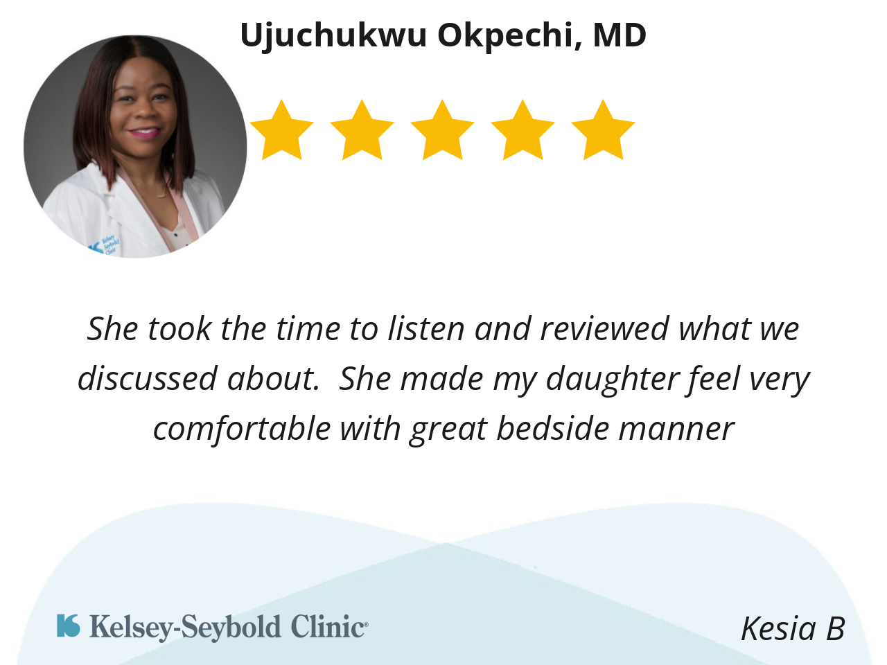 She took the time to listen and reviewed what we discussed about. She made my daughter feel very comfortable with great bedside manner