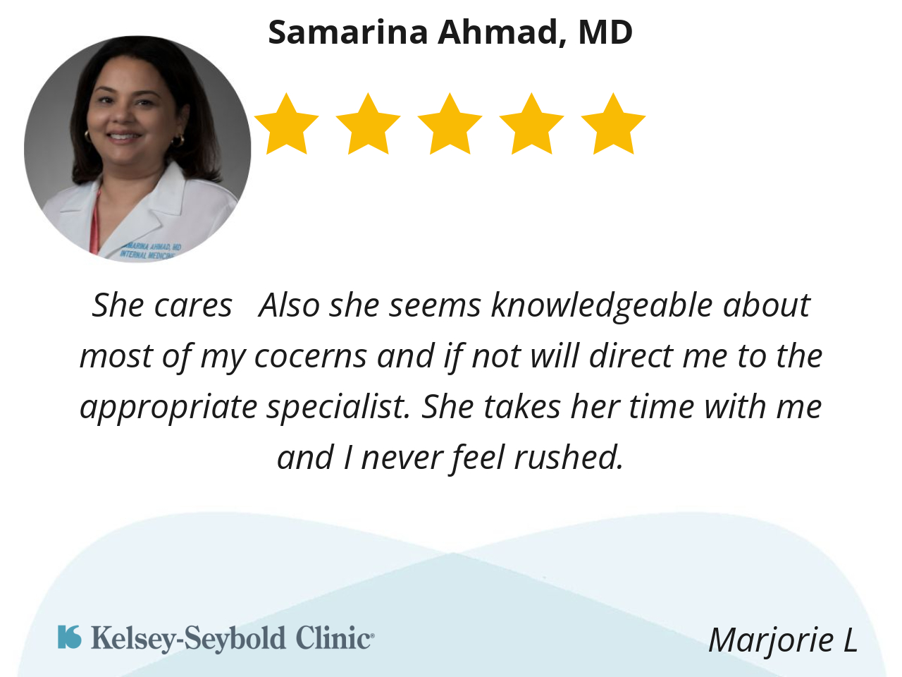 Dr, Samarina Ahmad is a great professional, caring and knowledgeable. She is the reason I go to Kelsey Sebold.
