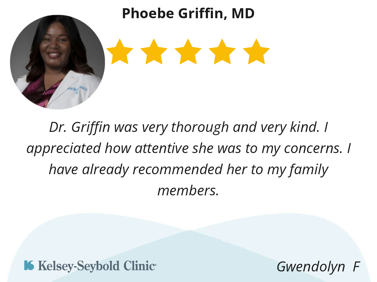 Dr. Griffin was very thorough and very kind. I appreciated how attentive she was to my concerns. I have already recommended her to my family members.