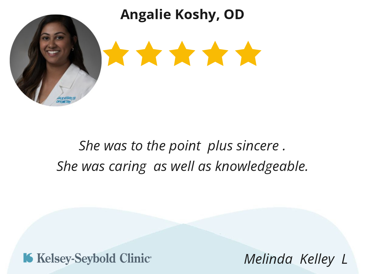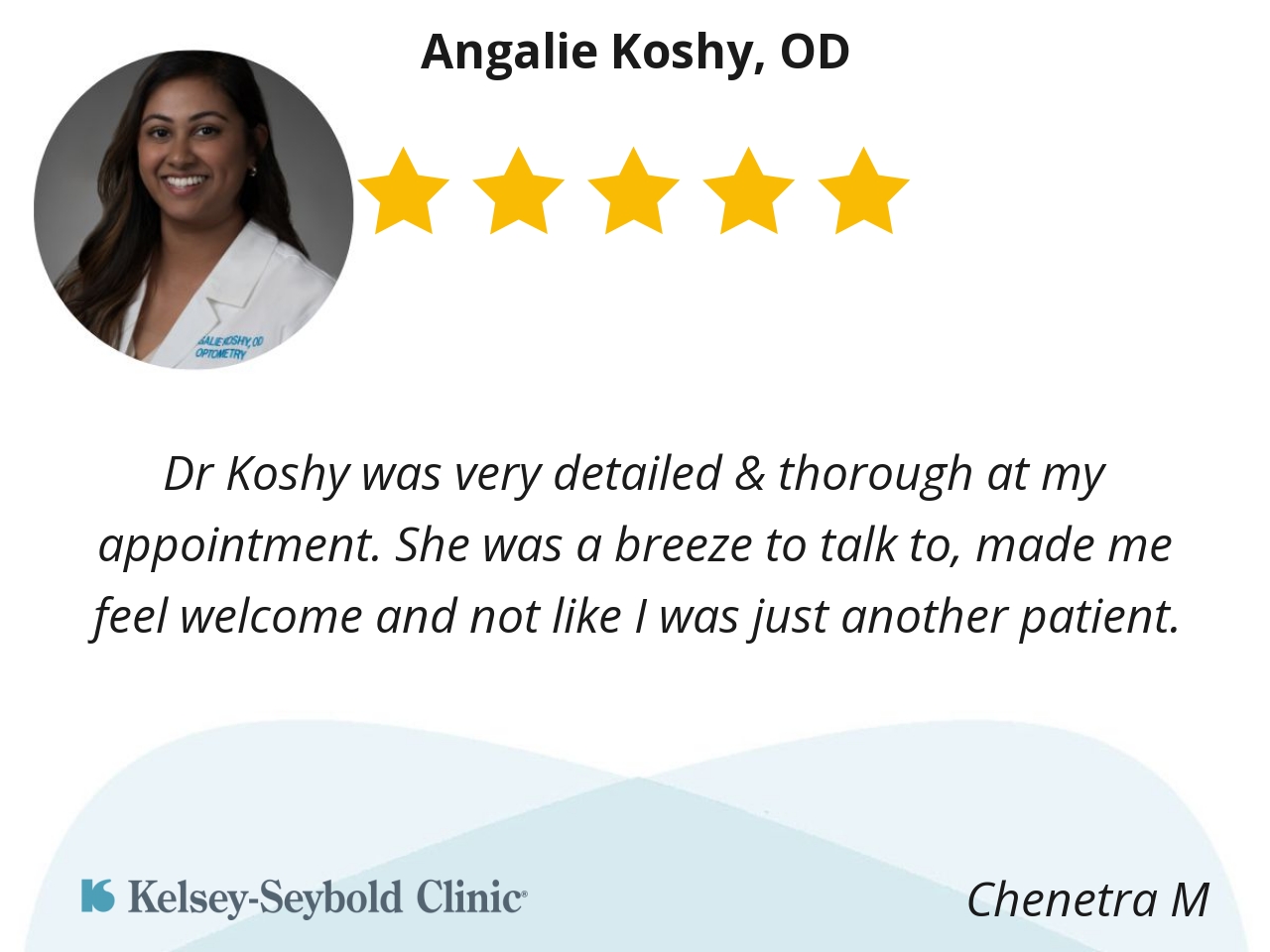 Dr Koshy was very detailed & thorough at my appointment. She was a breeze to talk to, made me feel welcome and not like I was just another patient.