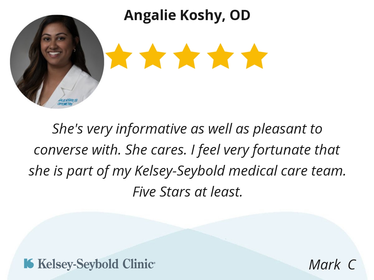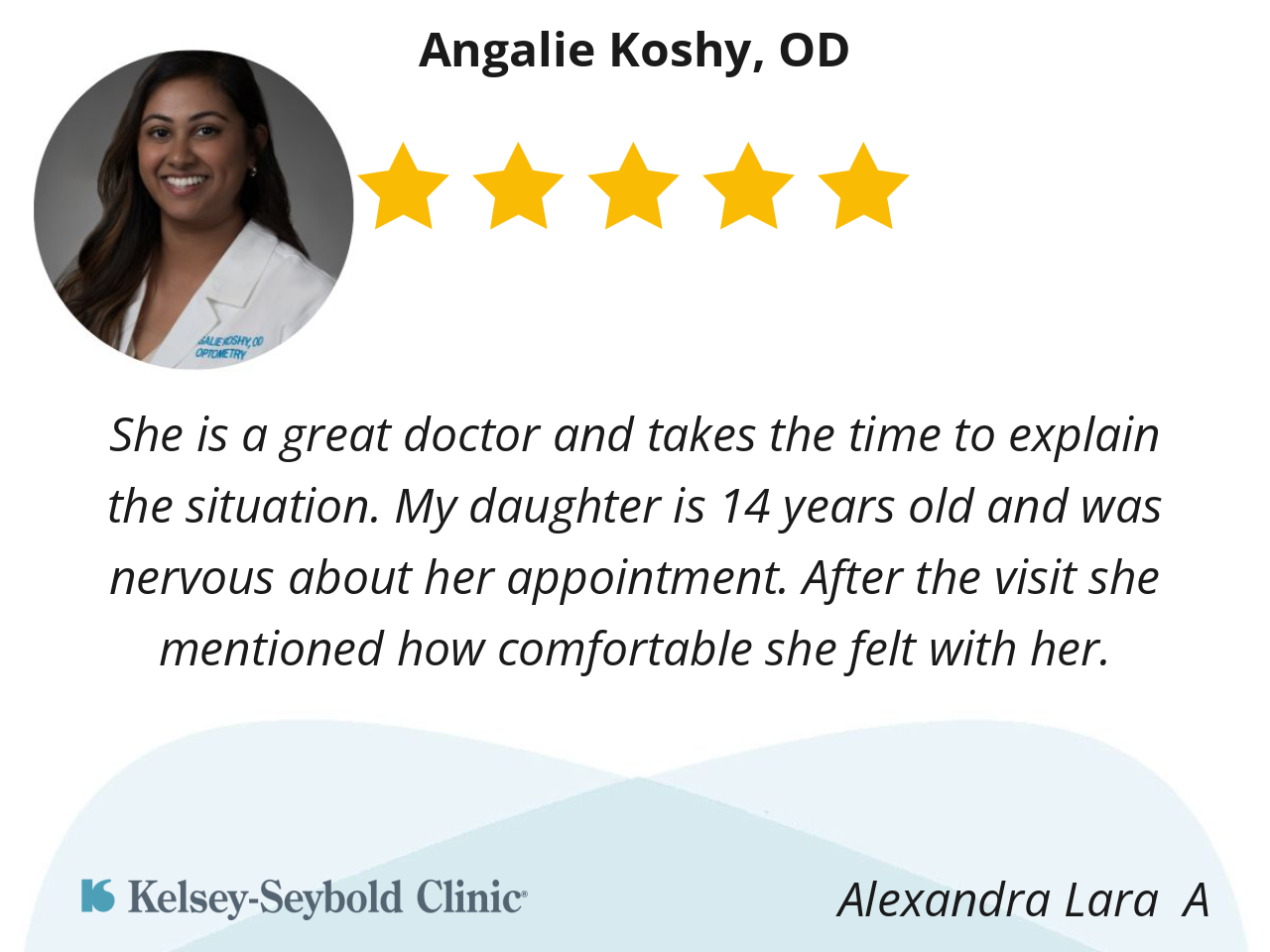 I lik Dr. Koshy because she listens to me and explains every test throughly..